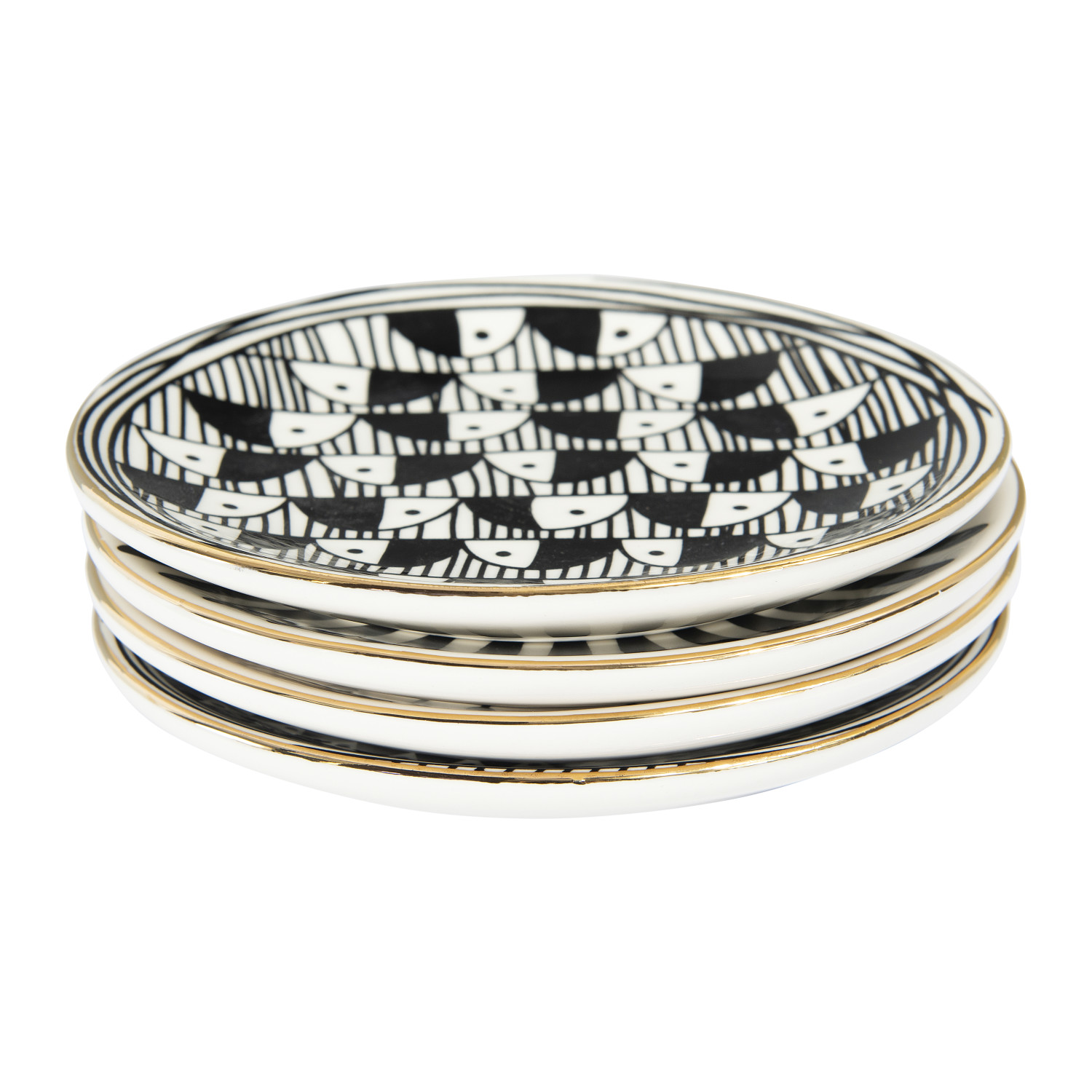 Stoneware Plate w/ Pattern & Gold Electroplating, Black & White, 4 Styles