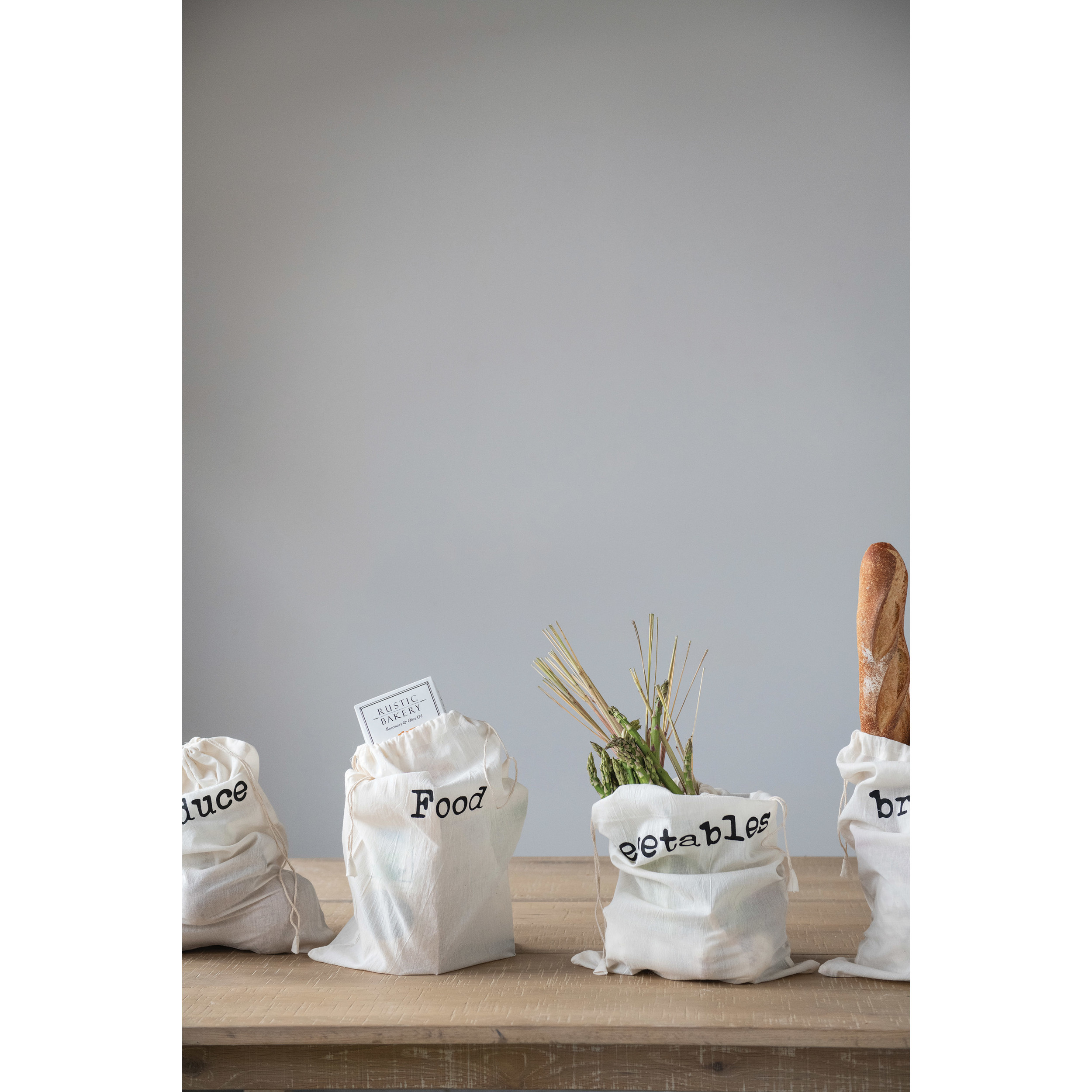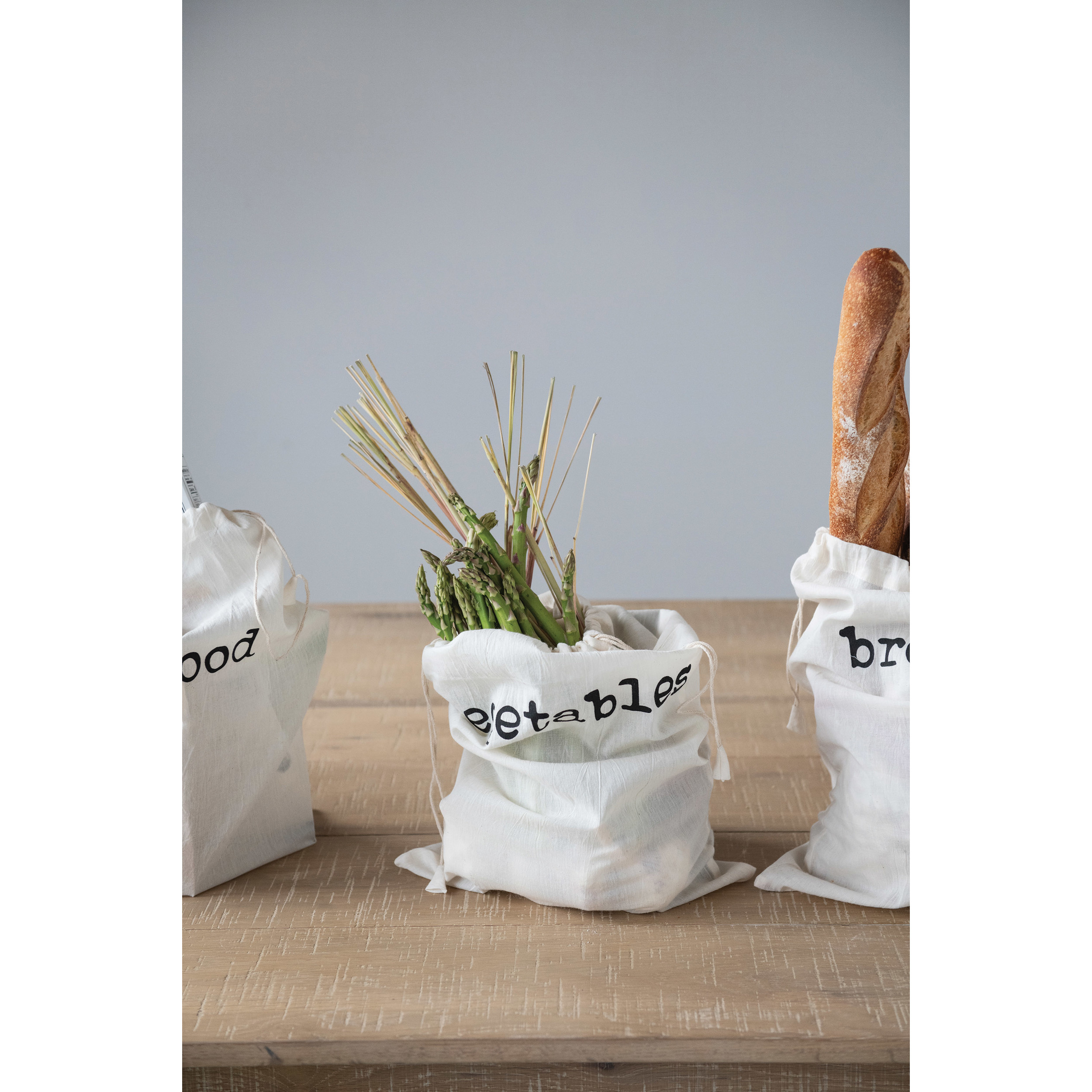 Catalog Name: 12"L x 18"H Cotton Printed Reusable Drawstring Food Bags, White & Black, 4 Styles
