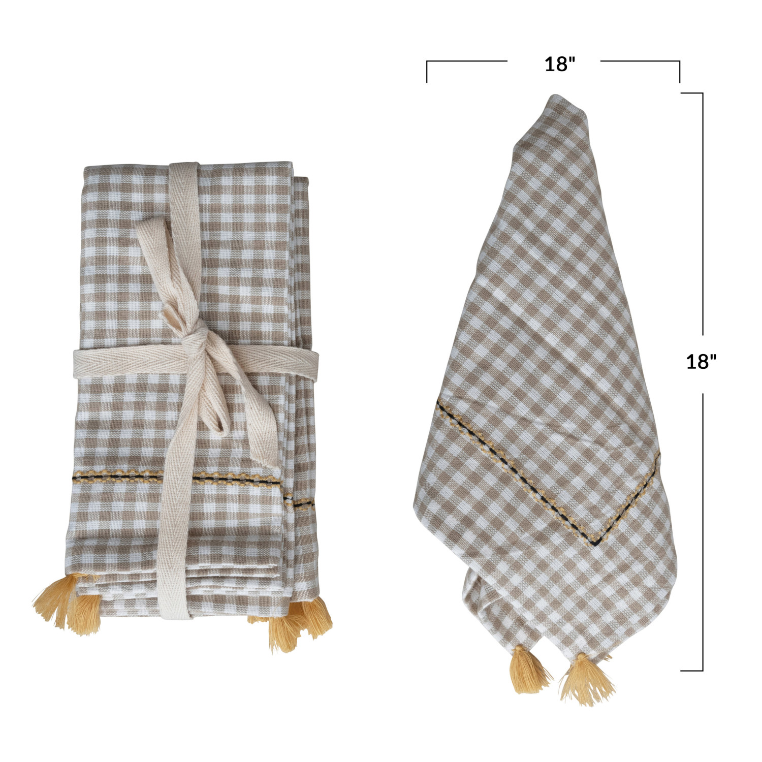 Catalog Name: 18" Square Cotton Napkins w/ Embroidery & Tassels, Mustard Color, White & Beige Gingham, Set of 4 Tied w/ Cotton Tape