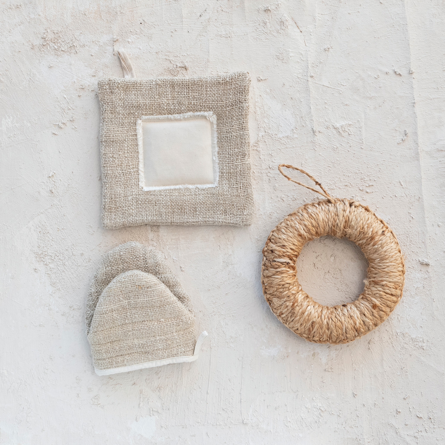 Catalog Name: 6"L x 6"W Woven Hemp Fiber & Cotton Canvas Oven Mitt, Natural & White