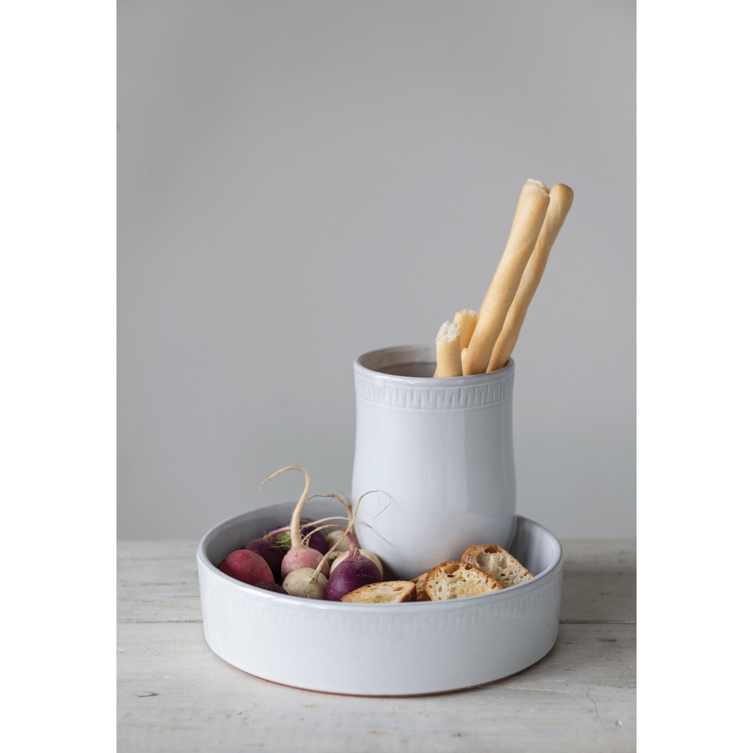 Catalog Name: 9-1/2" Round x 6-3/4"H Terra-cotta Tray w/ 2 Sections, Reactive Glaze, White (Each One Will Vary)