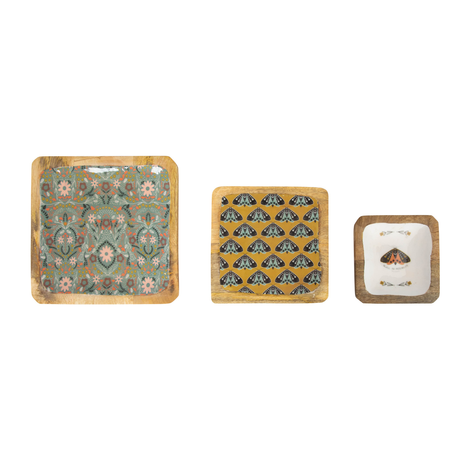 Catalog Name: 10" Square, 8" Square & 6-1/4" Square Enameled Mango Wood Trays w/ Moths & Florals, Multi Color, Set of 3 ©