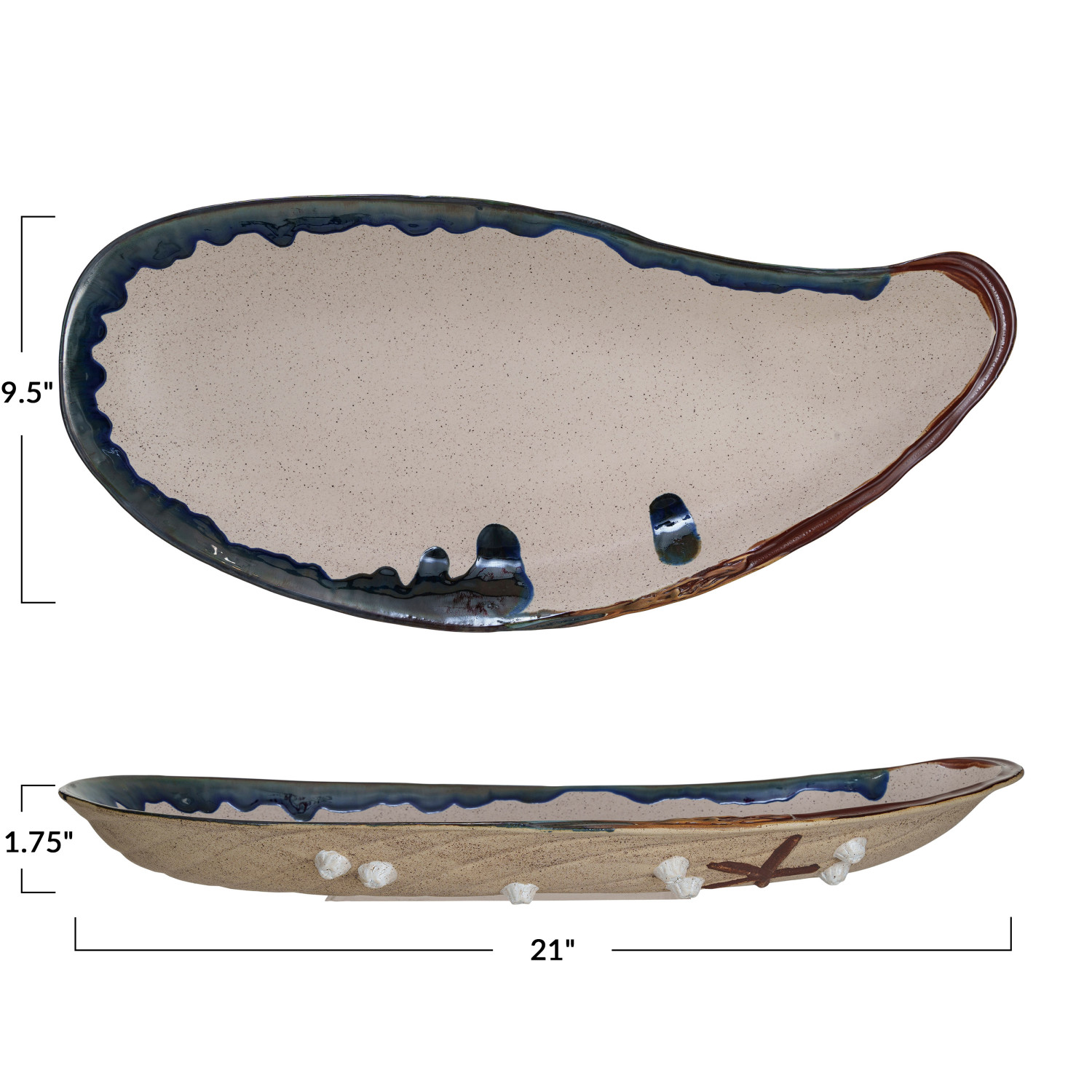 This brown stoneware shell plate with reactive glaze is a versatile and elegant addition to any serveware collection. Its unique shell shape adds a dynamic and elegant touch, while the reactive glaze finish creates a textured and varied look. The glossy surface enhances its appearance and durability. Made of sturdy stoneware, this plate can withstand high temperatures and frequent use. Its oval shape accommodates a large amount of food and its brown color complements any table setting. The plate can suit any style, from coastal to French country, farmhouse, beach, or nautical. Measuring 21 inches in length, 9.5 inches in width, and 1.75 inches in height, it can serve a large group of guests. This brown stoneware shell plate will impress guests and enhance food presentation.