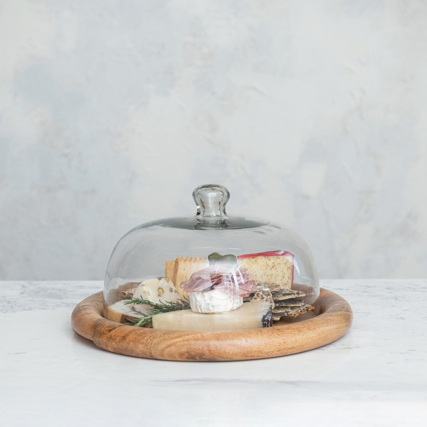 Catalog Name: 16" Round x 8"H Glass Cloche w/ Mango Wood Base, Natural, Set of 2