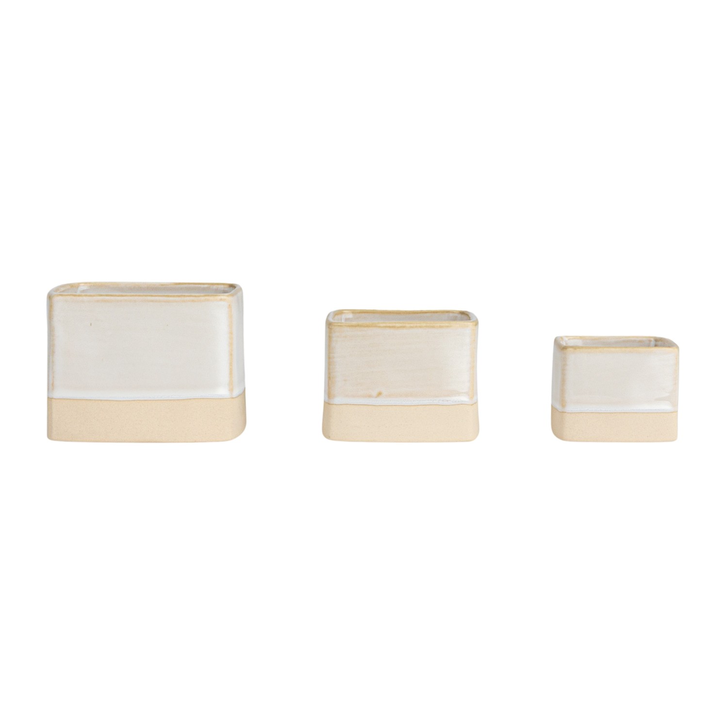 Catalog Name: 2-1/4" Square x 1-3/4"H, 3" Square x 2-1/4"H & 3-1/2" Square x 2-3/4"H Stoneware Nesting Containers, Reactive Glaze, Cream Color & Unglazed, Set of 3 (Each One Will Vary)