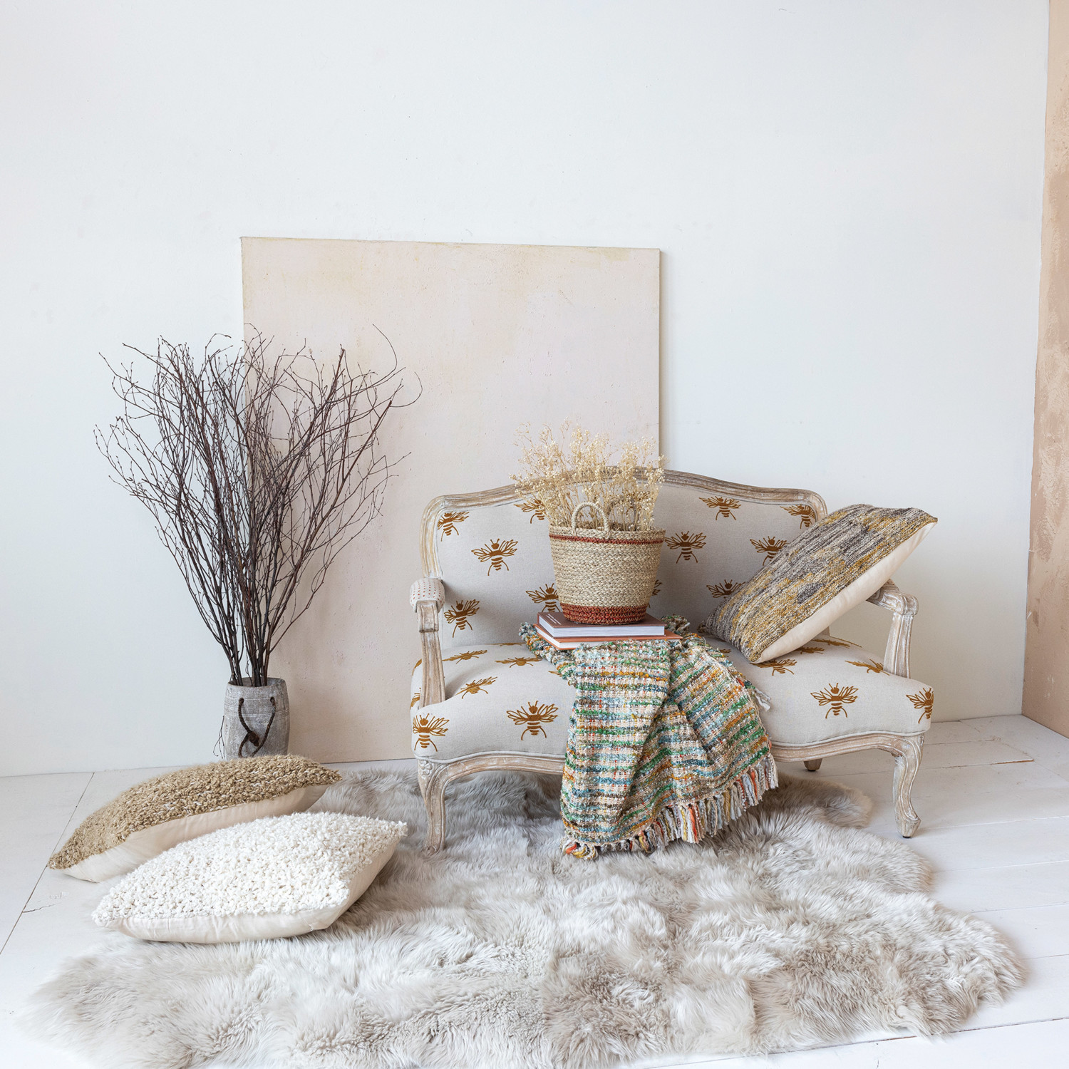This charming and cozy sofa is made of cotton and linen, with a mango wood frame and embroidered bees pattern. The body is a natural and mustard color, adding warmth and contrast. The mango wood frame and legs add stability and elegance, with a whitewashed finish complementing the fabric. The embroidered bees pattern adds whimsy and flair, matching the body and creating a dynamic look. This sofa is suitable for any room style, from farmhouse to French country, boho to Scandinavian, lodge to square. It can be used as a sofa, daybed, or guest bed, and can be placed in various spaces. The sofa is eco-friendly, durable, and soft, and comes fully assembled. It measures 50 inches in length, 27 inches in width, and 35 inches in height. This versatile and cozy accessory will enhance the room style and ambiance.