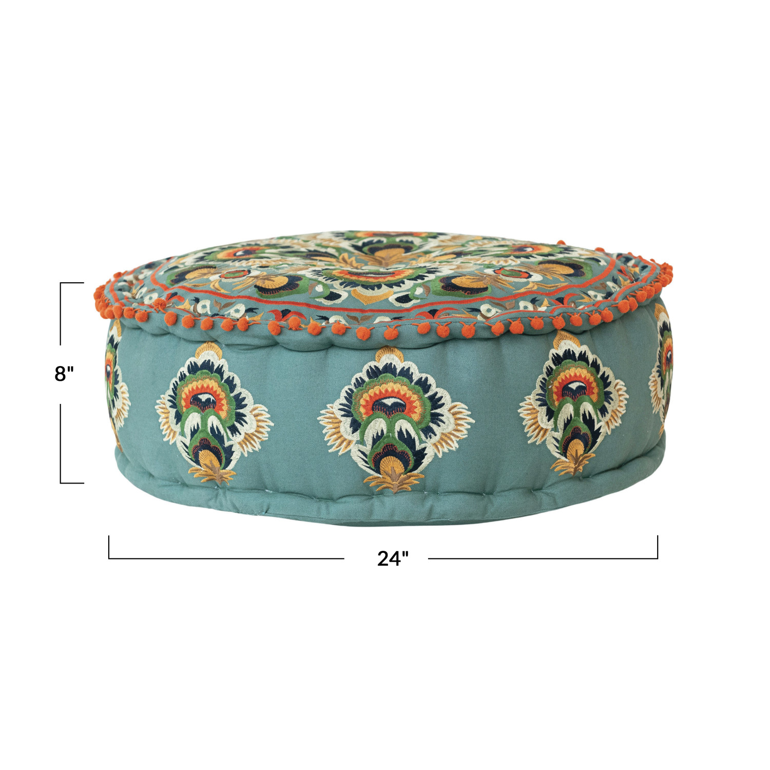 Catalog Name: 24" Round x 8"H Cotton Embroidered Pouf w/ Pom Poms, Multi Color