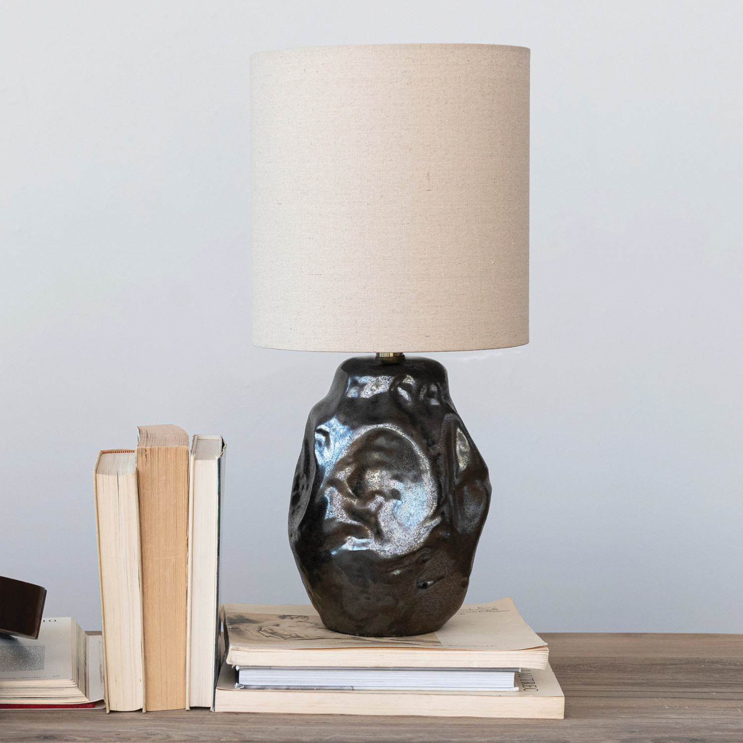 Catalog Name: 13" Round x 20"H Ceramic Organic Shaped Table Lamp w/ Fabric Shade & Inline Switch, Metallic Reactive Glaze, Gunmetal Color (Each One Will Vary)