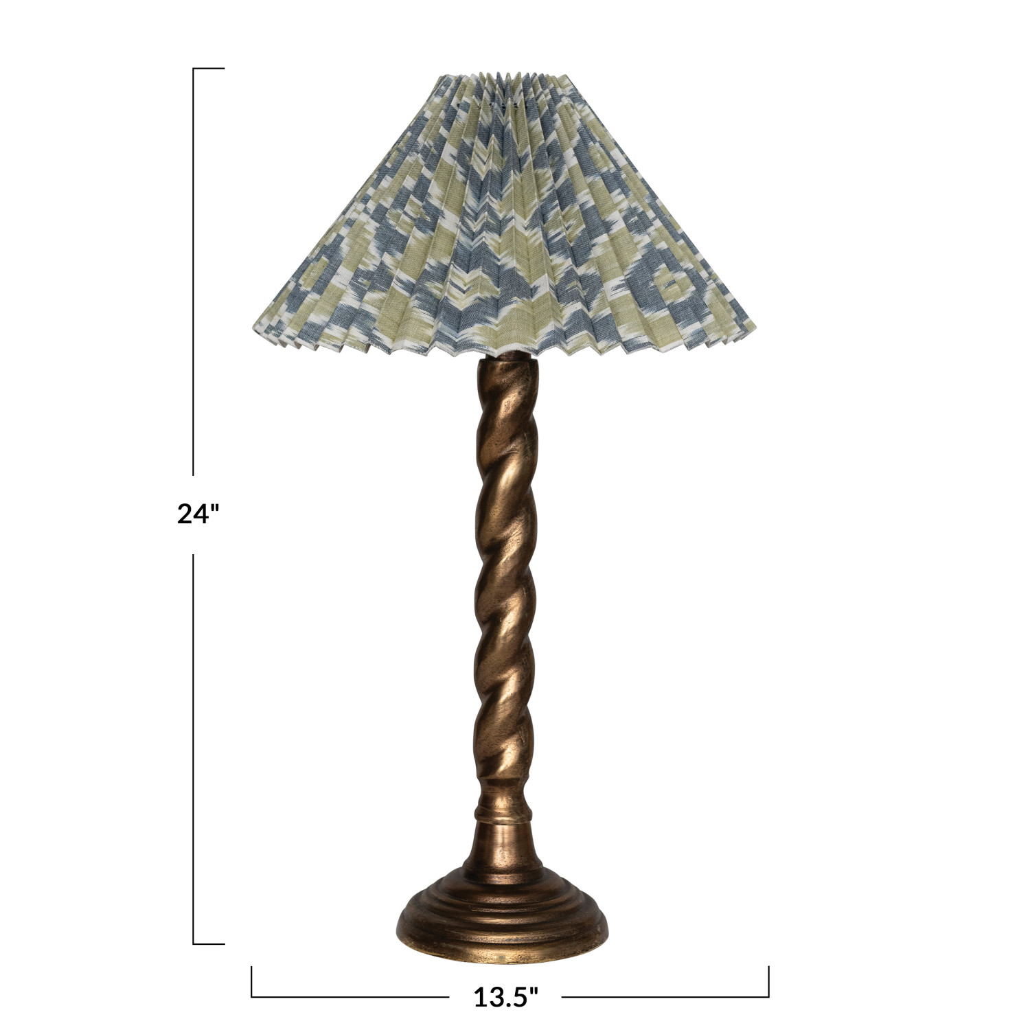 Catalog Name: 13-1/2" Round x 24"H Metal Candlestick Table Lamp w/ Pleated Cotton Ikat Shade & Inline Switch, Antique Brass Finish & Multi Color