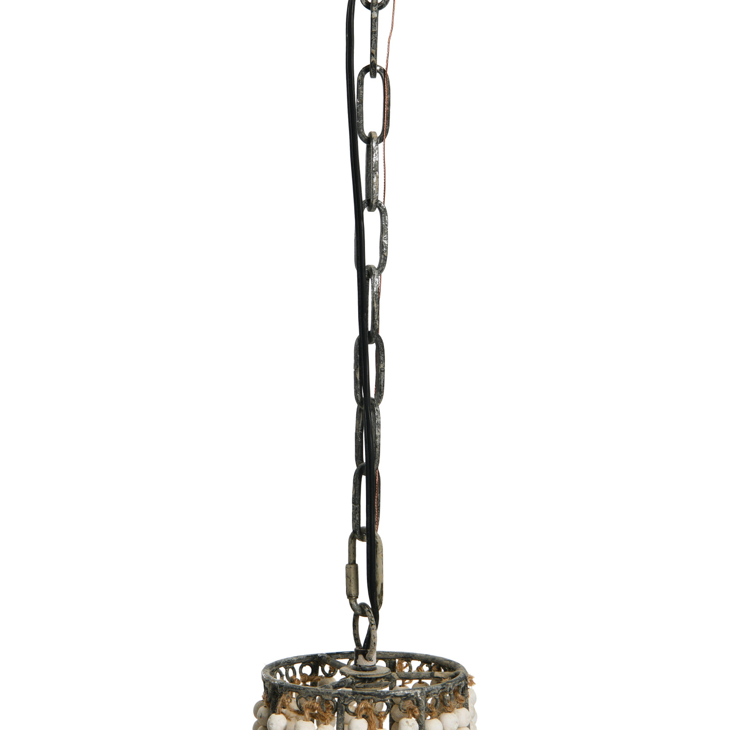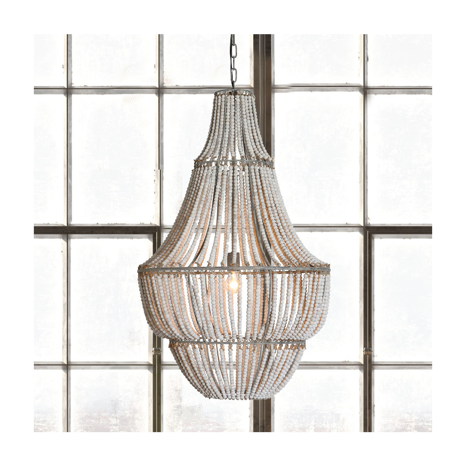 Catalog Name: 25-1/2" Round x 41-1/4"H Metal & Wood Bead Chandelier, 6' Chain & 10' Cord, Whitewashed, Truck Ship (40 Watt Bulb Maximum, Hardwire Only)
