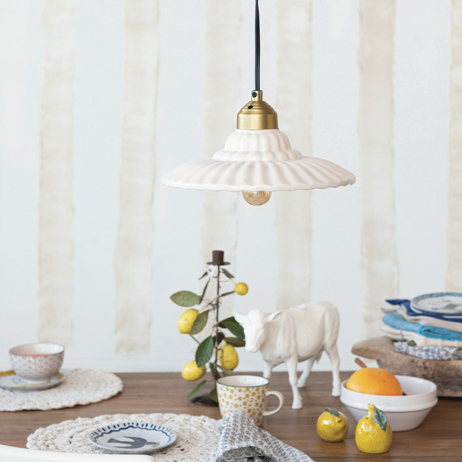 Catalog Name: 10-3/4" Round x 5-1/2"H Stoneware & Metal Pleated Pendant Lamp, 6' Cord, Antique Brass Finish & Cream Color (Hardwire Only)
