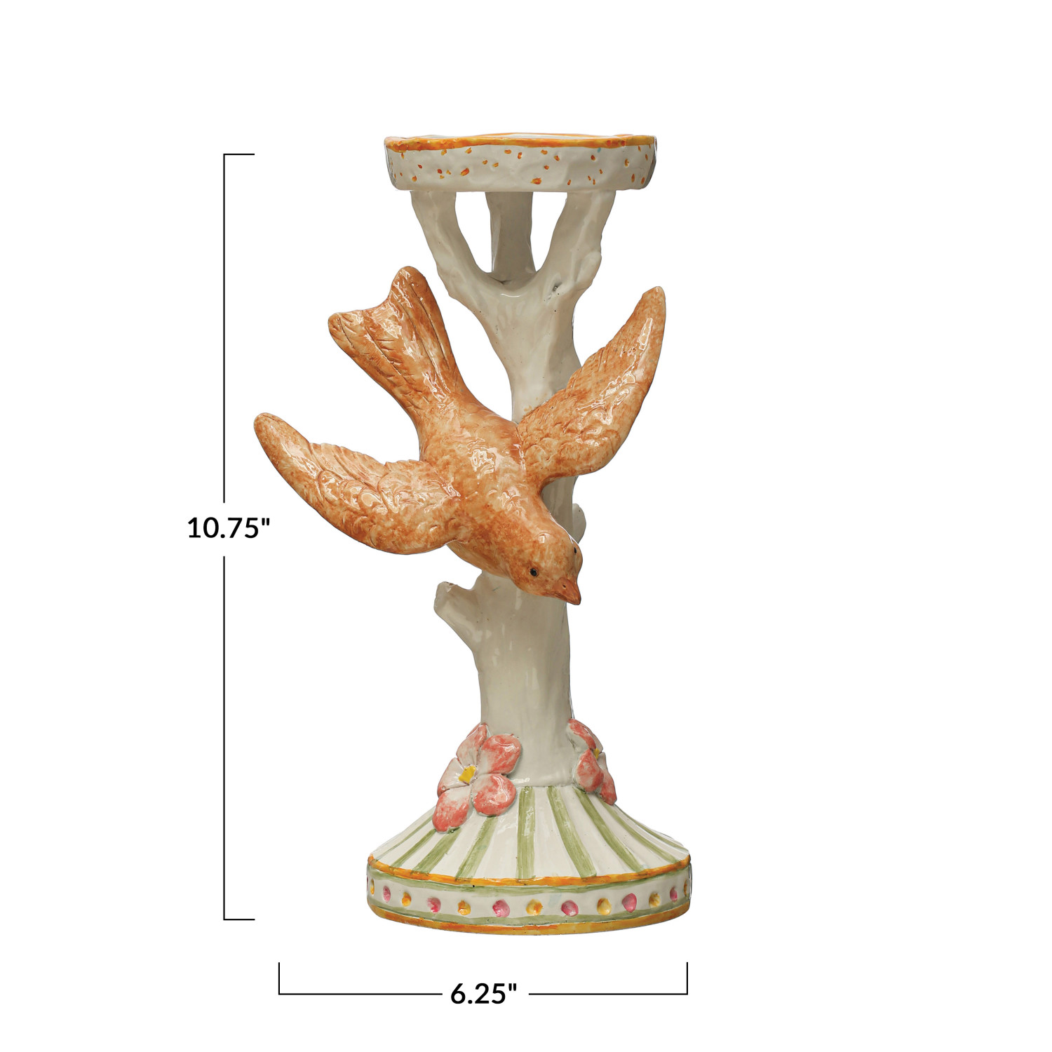 Mix and match the sculptural silhouettes, stylish hues, and unique finishes of our candle and incense holder collection to create the ultimate tablescape. Instantly transform a dining table, dresser, or mantelpiece into a stunning display of ambiance and warmth with carefully chosen bases for a refined candlelight arrangement. Choose from a wide array of materials from iron and marble to wood and stone, and styles from mid-century modern and glam to farmhouse and vintage. From classic taper holders to global-inspired pillar holders and contemporary incense burners and shimmering votives, this collection will create a welcoming atmosphere that is guaranteed to impress. This French country-inspired candle holder features a multicolor silhouette of a bird flying near a tree. Display in a living space of any style from cottage to French country. Wipe clean with dry cloth. Made from resin and stone powder.