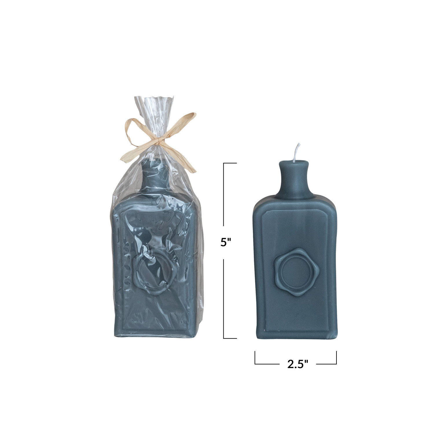 Catalog Name: 2-1/2"L x 1-1/2"W x 5"H Unscented Embossed Vintage Bottle Shaped Candle, Teal (Approximate Burn Time 5 Hours)