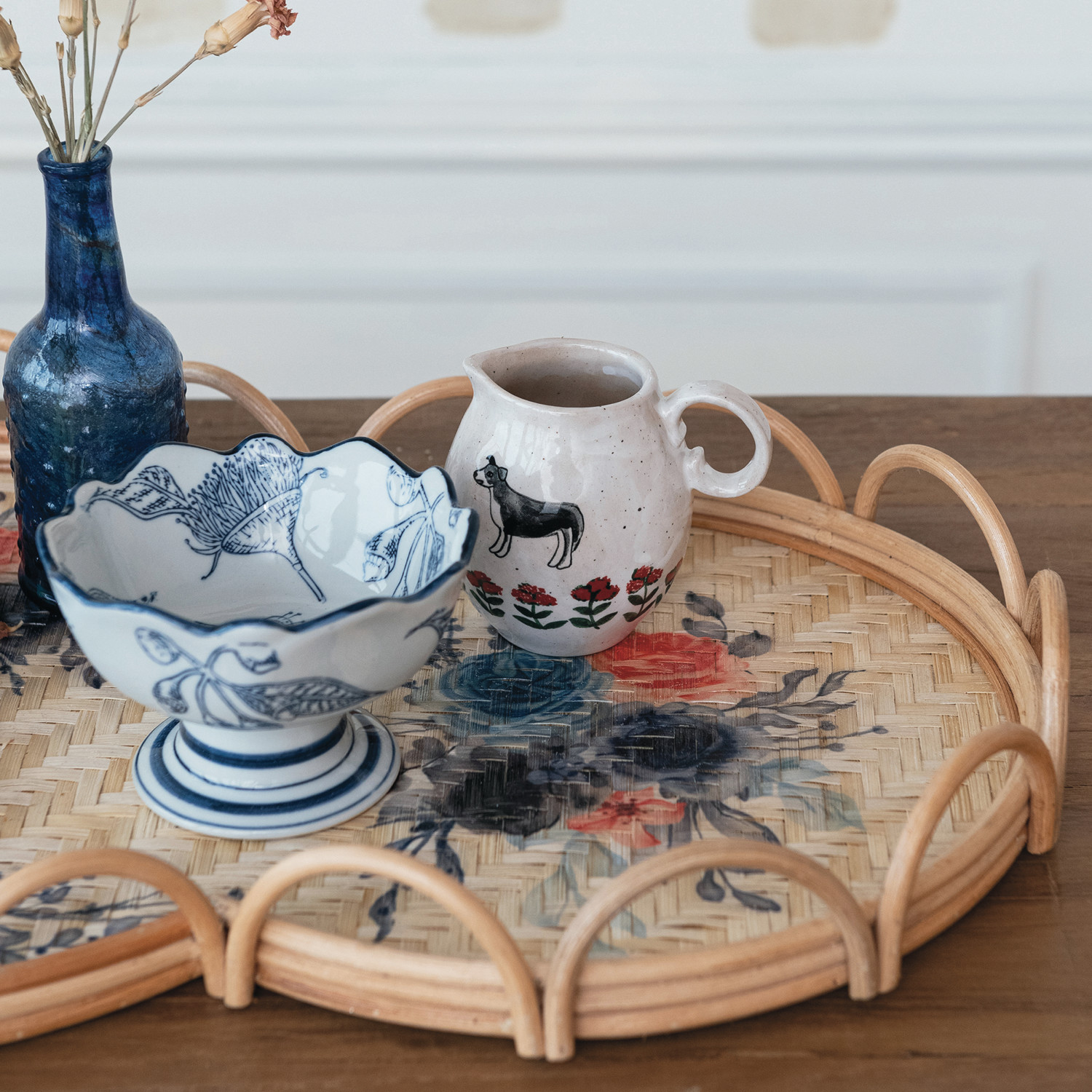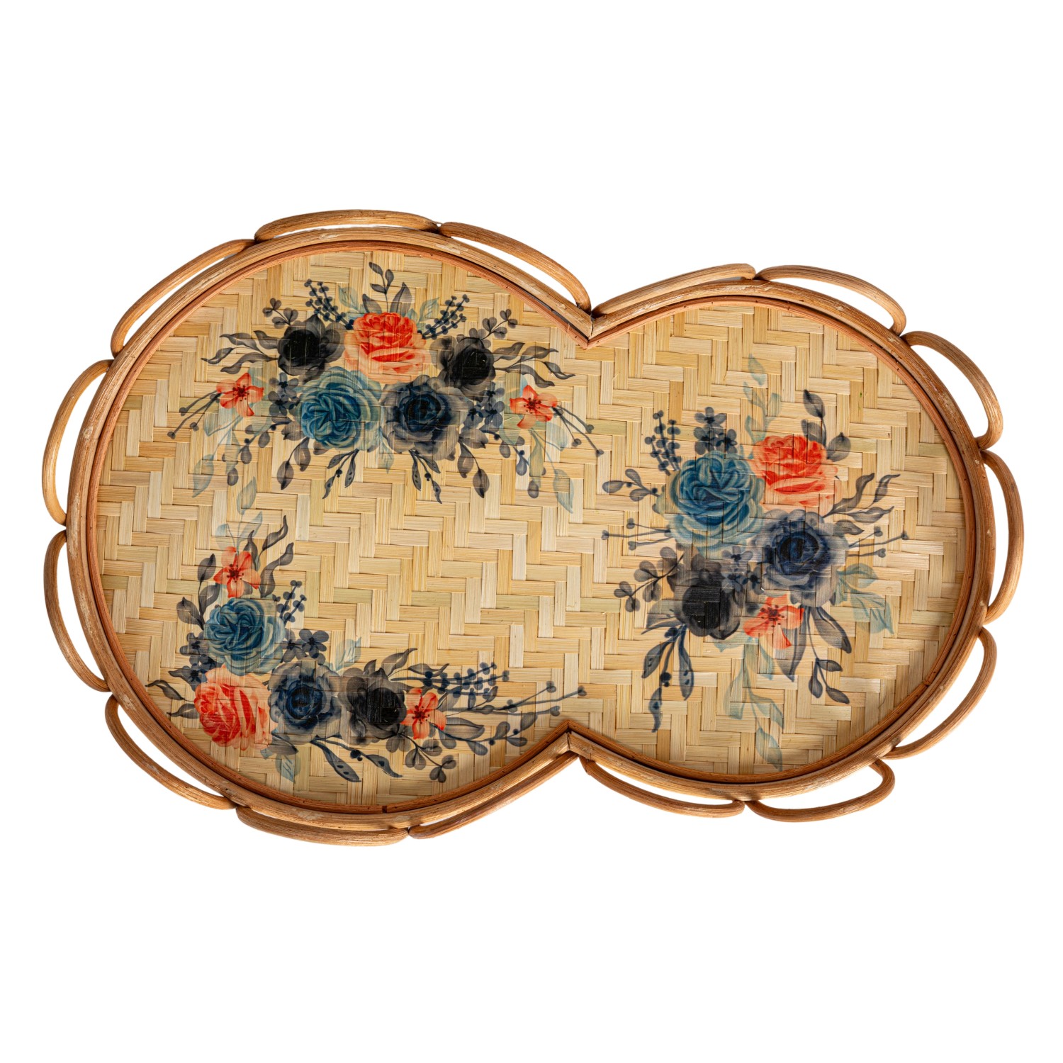 Catalog Name: 23-1/4"L x 15"W x 2-1/4"H Decorative Rattan & Bamboo Scalloped Tray w/ Printed Florals, Multi Color