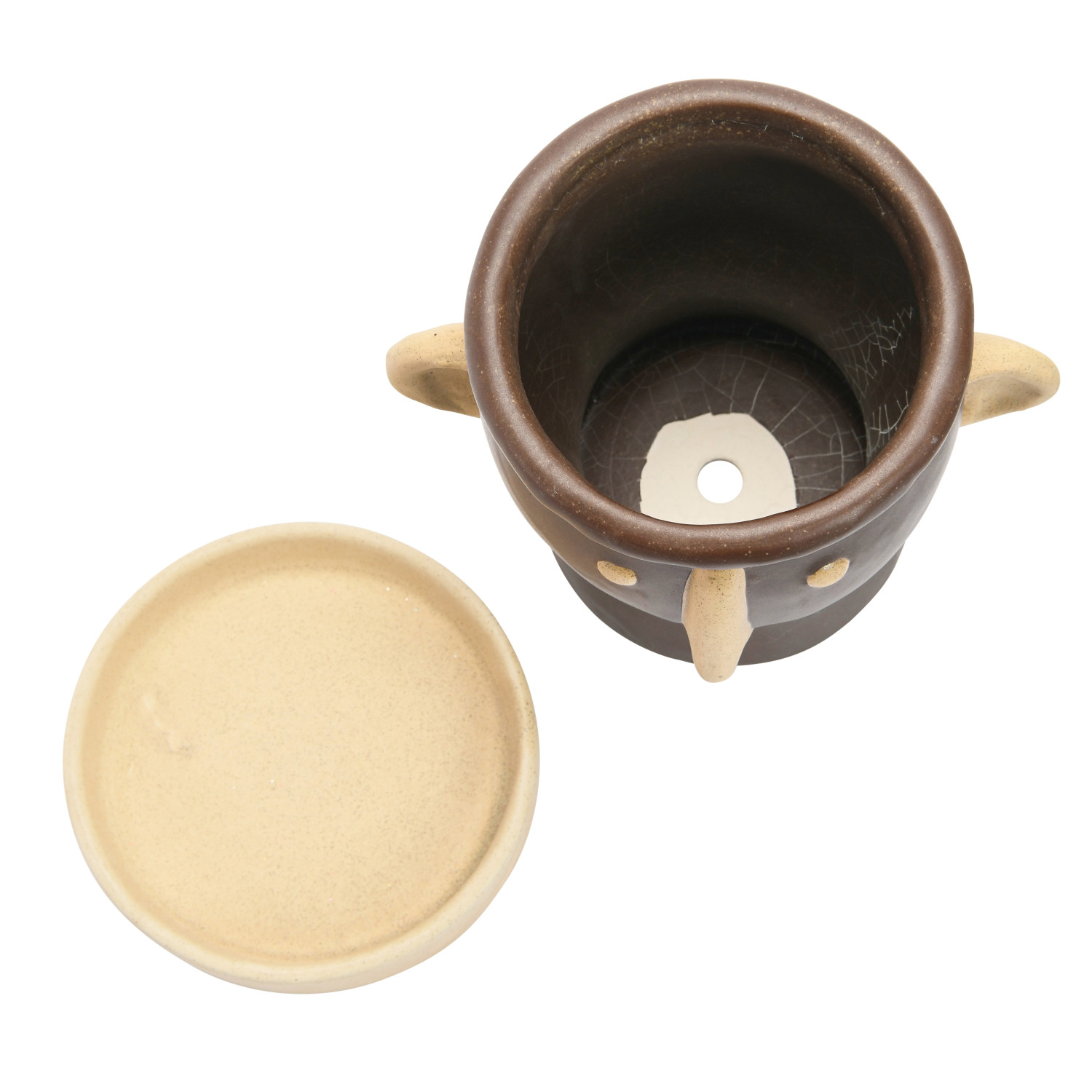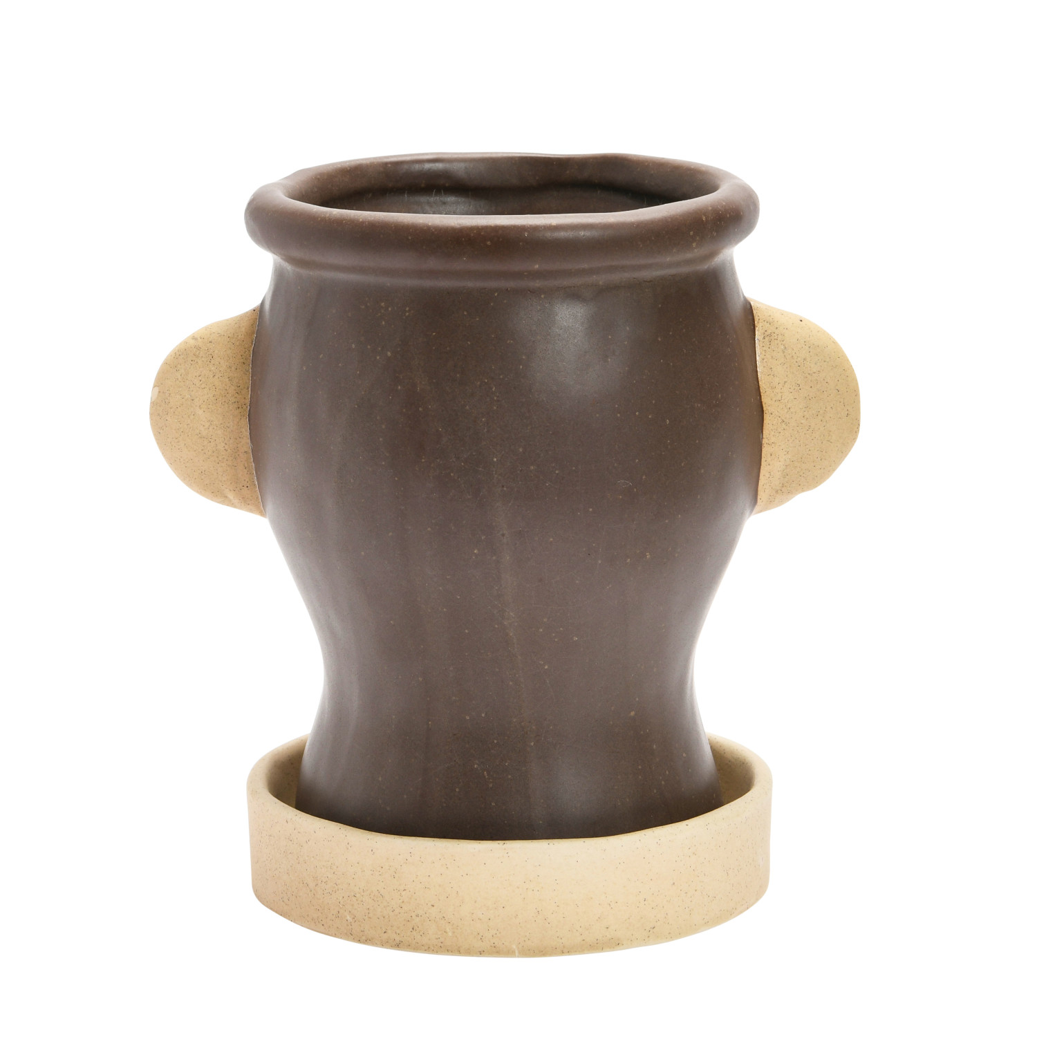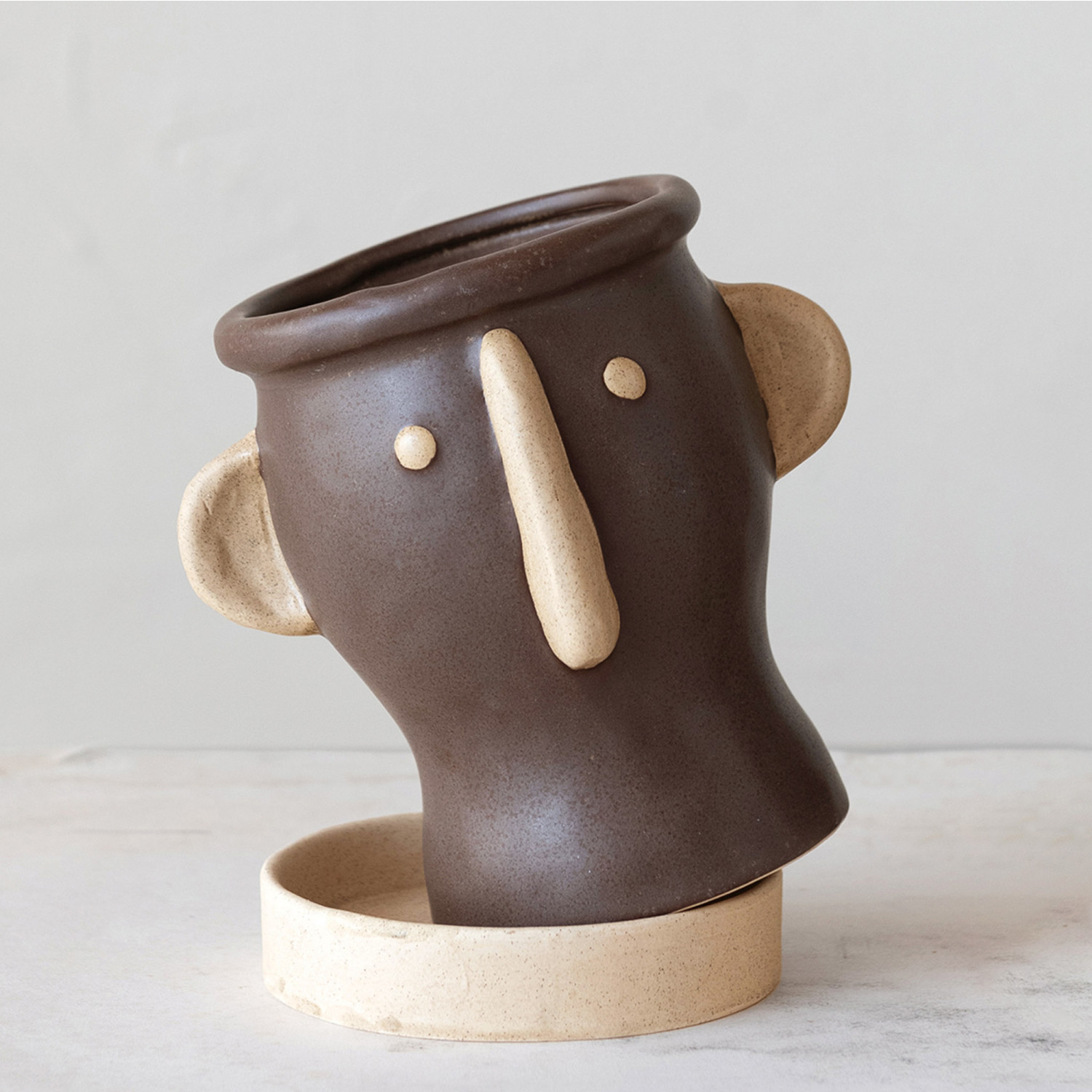 Catalog Name: 5" Round x 6-3/4"H Stoneware Face Planter w/ Saucer, Brown & Cream Color, Set of 2 (Holds 4" Pot)