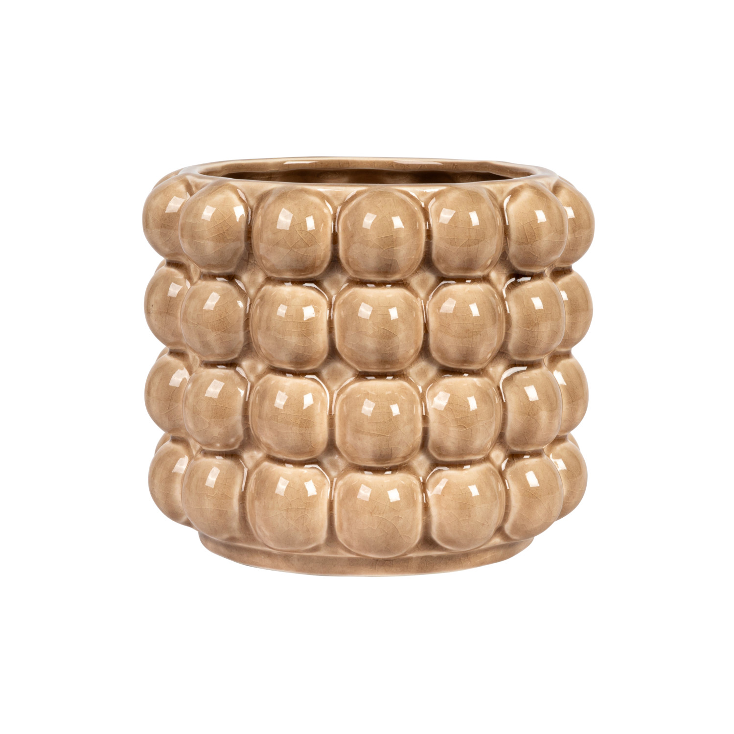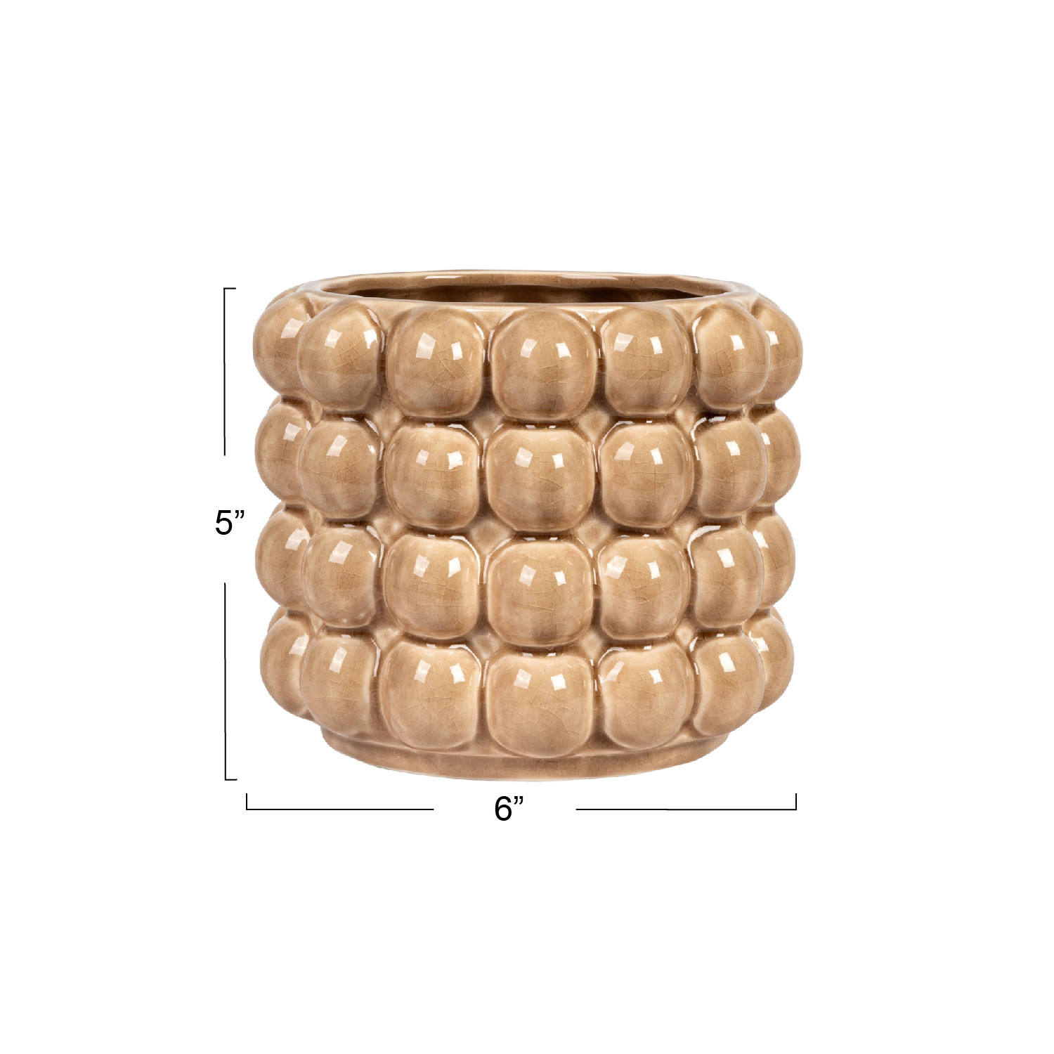 This tan stoneware planter with raised dots is a beautiful and functional piece that will enhance home decor. This planter is made of durable and high-quality stoneware that has a glossy finish and a textured surface of raised dots. The warm tan color and the raised dots create a rustic and cozy look that complements any indoor or outdoor space. The planter is designed to hold a 4-inch potted plant, making it suitable for small to medium-sized plants such as succulents, herbs, or flowers. Use this planter as a standalone piece or pair it with other planters to create a stunning display. The planter measures 6 inches in diameter and 5 inches in height, making it a perfect size for any tabletop, shelf, or windowsill. This tan stoneware planter with raised dots is a great way to add some charm and personality to the home. A round stoneware planter with a textured surface of raised dots in a warm tan color. A great choice for adding some rustic charm and natural beauty to any indoor or outdoor space. It is suitable for small to medium-sized plants. Made of stoneware.
