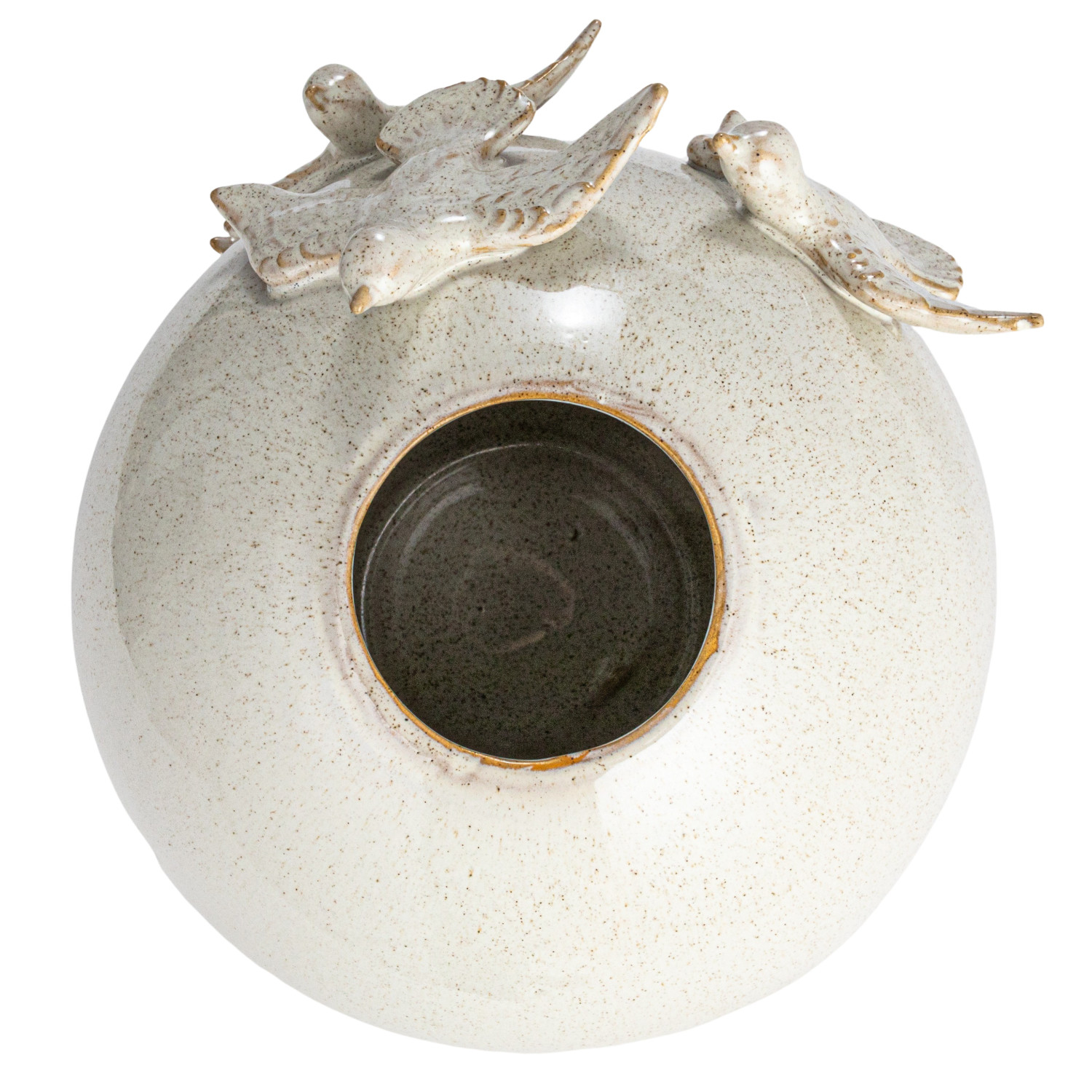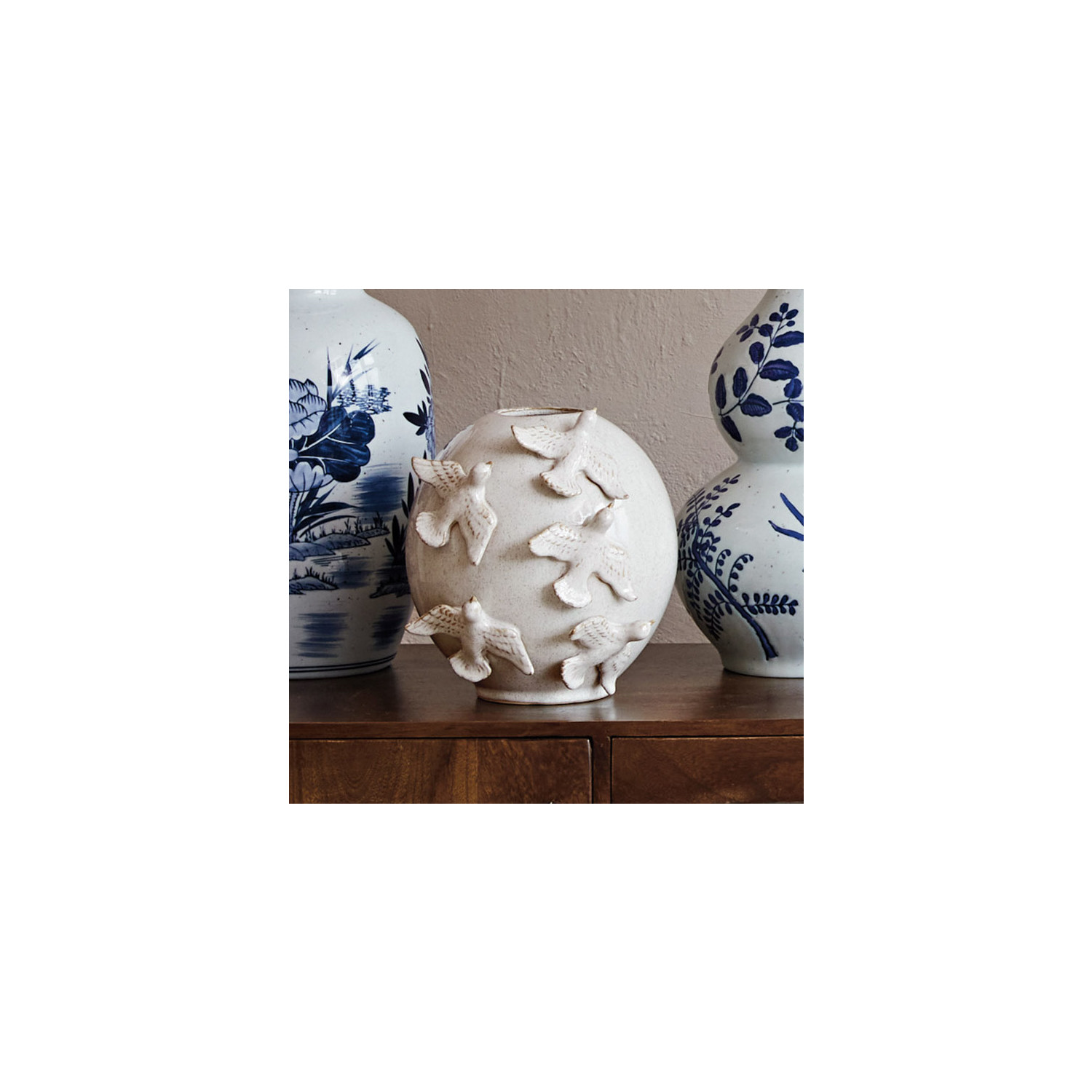 Catalog Name: 10-1/2" Round x 9-3/4"H Handmade Stoneware Vase w/ 3D Birds, Reactive Glaze, Cream Color (Each One Will Vary)