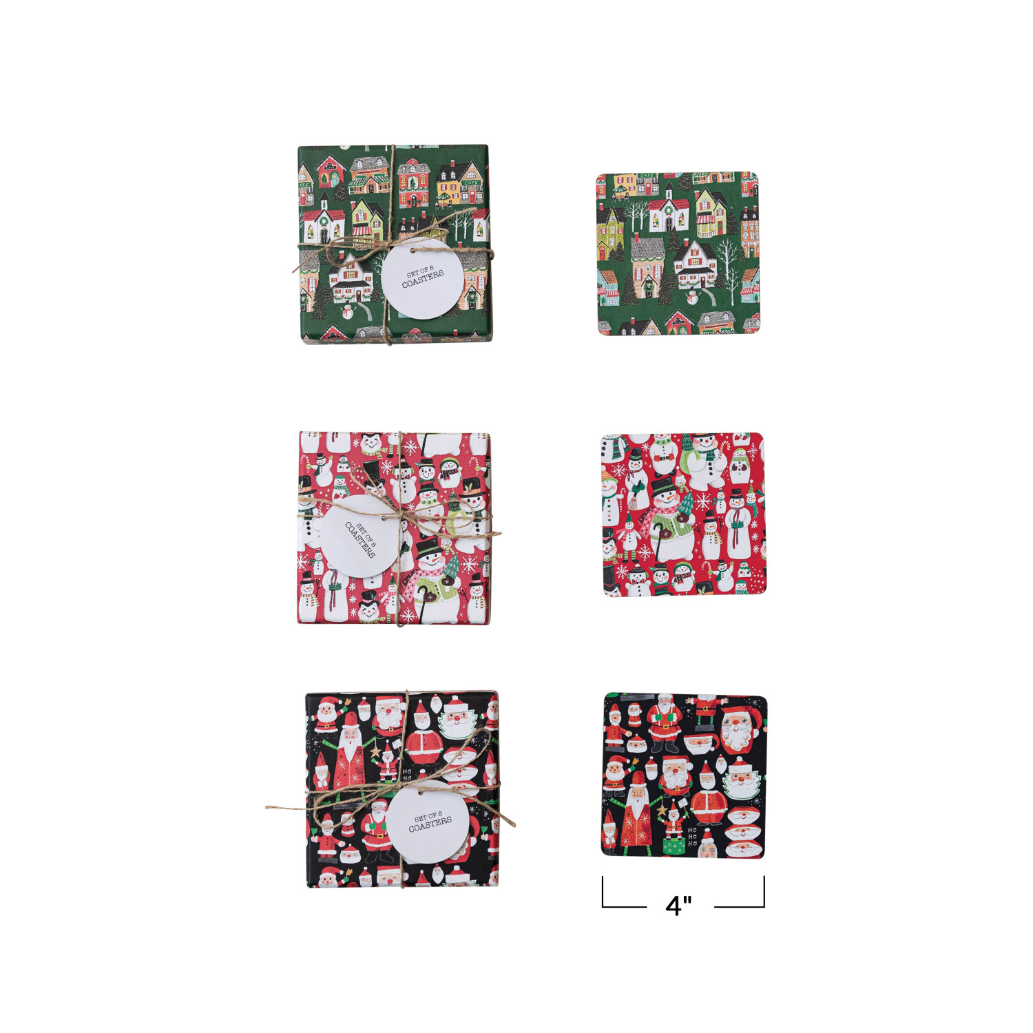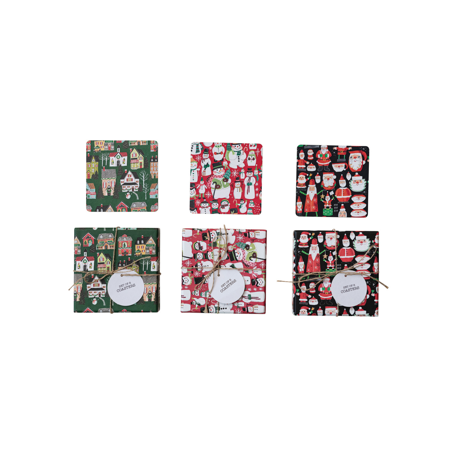 Catalog Name: 4" Square Printed Recycled Paper & Cardboard Coasters w/ Holiday Patterns, Multi Color, 3 Styles, Boxed Set of 8 ©