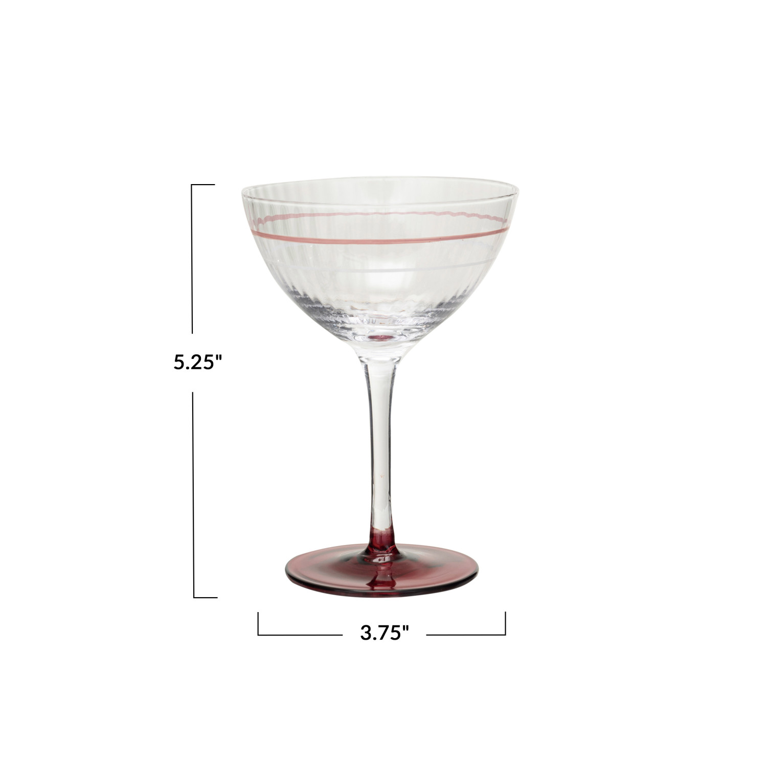 Catalog Name: 3-3/4" Round x 5-1/4"H 6 oz. Vintage Reproduction Stemmed Fluted Champagne/Coupe Glass w/ Hand-Painted Stripe & Red Base