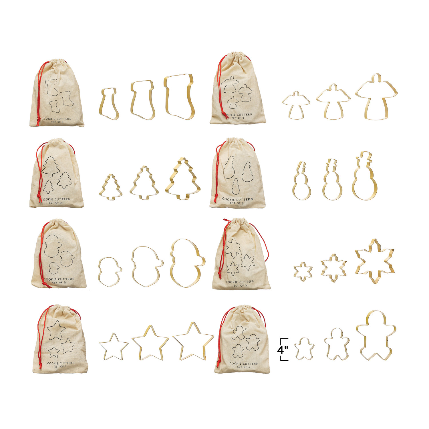 Catalog Name: 4"L - 5"L Stainless Steel Cookie Cutters in Printed Drawstring Bag, Gold Finish, Set of 3, 8 Styles