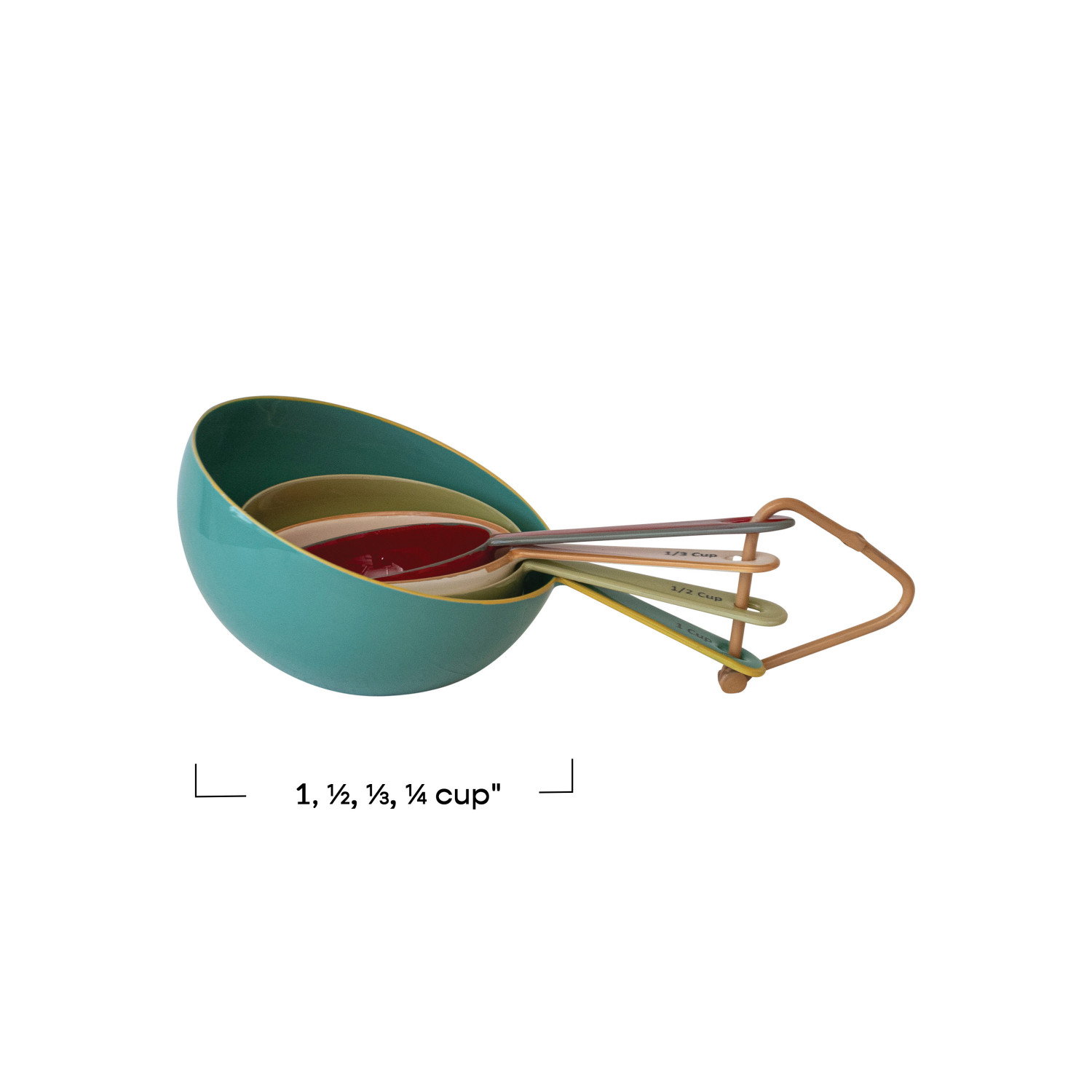 Catalog Name: 1, 1/2, 1/3, 1/4 Cup Enameled Stainless Steel Measuring Cups w/ Colored Edge, 4 Colors, Set of 4