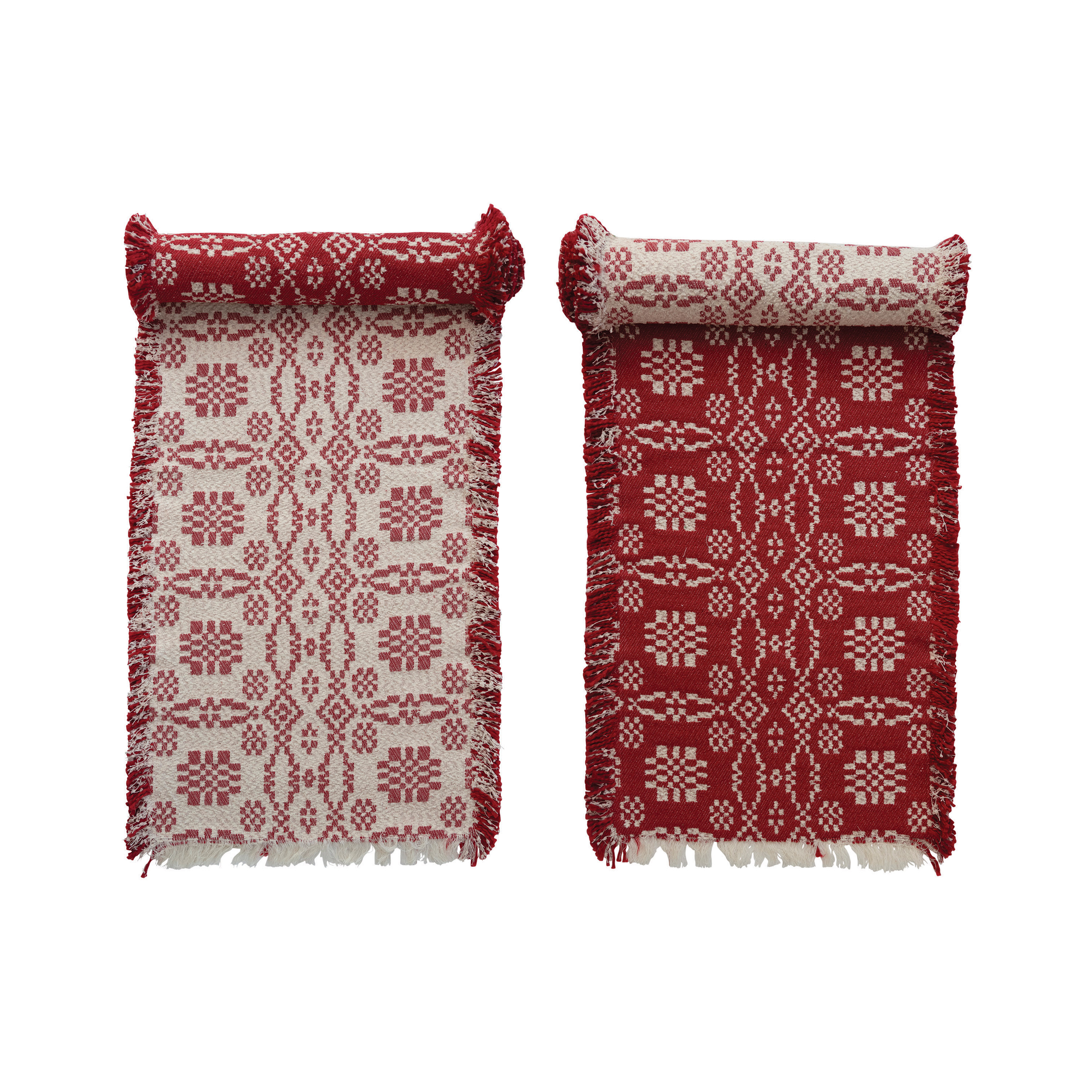 Catalog Name: 72"L x 14"W Two-Sided Woven Cotton Table Runner with Pattern and Fringe, Red and White