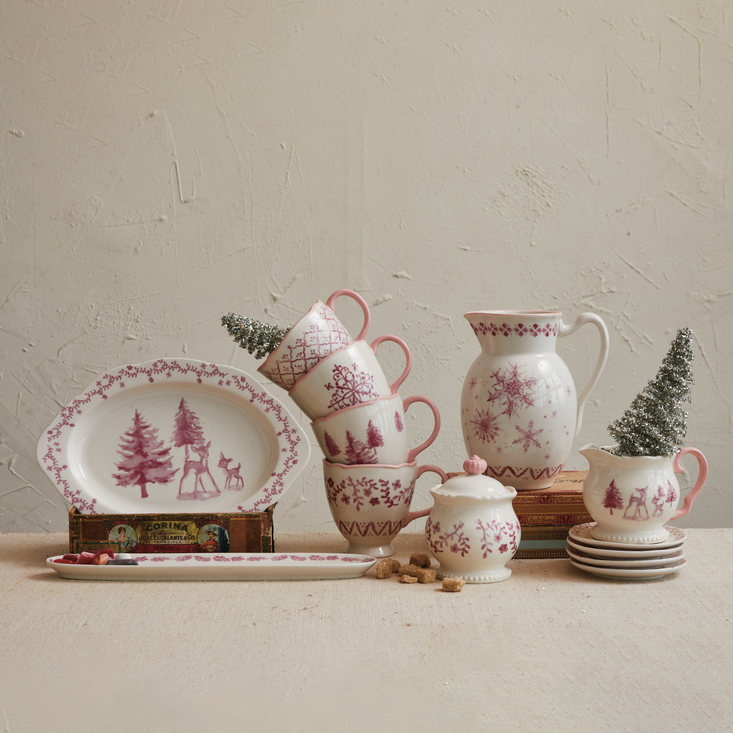 This enchanted stoneware platter, adorned with a tranquil scene of deer and trees, casts a spell of rustic elegance on the dining arrangement. The gentle hues of pink and cream create a backdrop that is both calming and inviting. Crafted from food-safe stoneware, the platter measures 12 inches long and 8.25 inches wide, offering a spacious surface for showcasing any favorite dishes. Whether used for serving guests or as a decorative element, this platter is sure to enchant and delight with its blend of natural beauty and functional design. A serene stoneware platter featuring a delicate deer and tree silhouette in a soft pink and cream color palette. A charming piece that brings a touch of woodland grace to any table setting, blending seamlessly with both modern and rustic decor. This platter is perfect for serving appetizers or as a picturesque centerpiece for the dining experience.