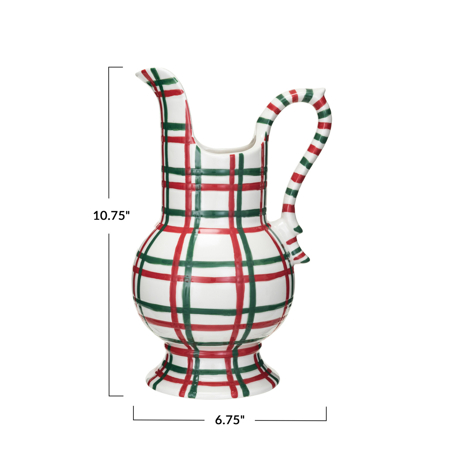 Catalog Name: 6-3/4"L x 5-1/2"W x 10-3/4"H 2 Quart Hand-Painted Stoneware Pitcher, Red, Green & White Plaid