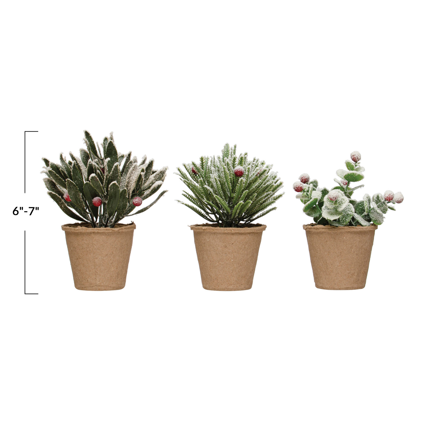 6"H - 7"H Faux Greens w/ Red Berries in Paper Mache Pot, Snow Finish & Green, 3 Styles