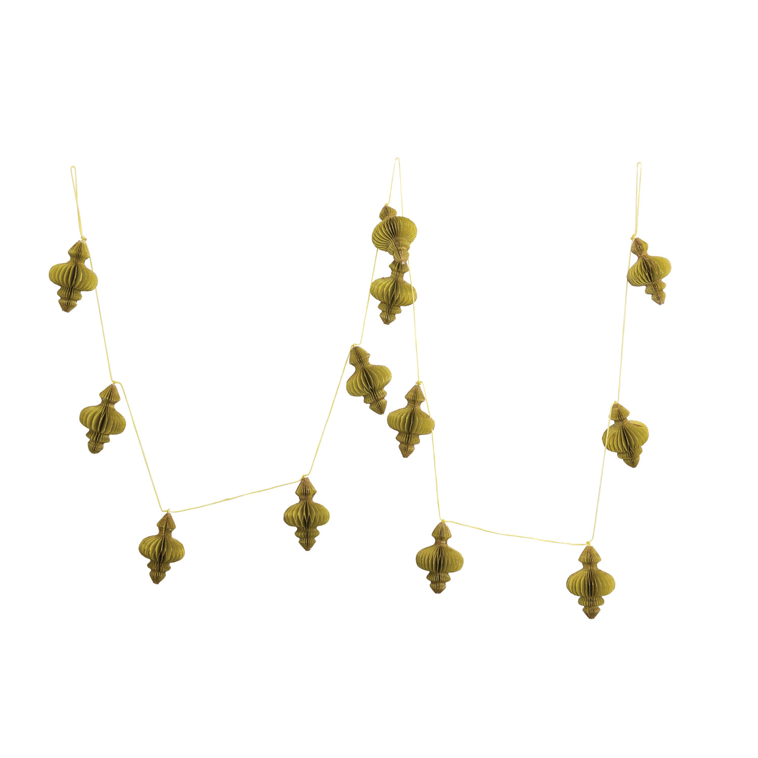 This festive garland features intricately handcrafted recycled paper honeycomb finial shapes finished with gold glitter. Add a touch of festive whimsy to any space with our enchanting collection of garlands, including stunning glass, sleek metal, and delightful mixed-material options, all expertly crafted to create a merry and bright atmosphere.