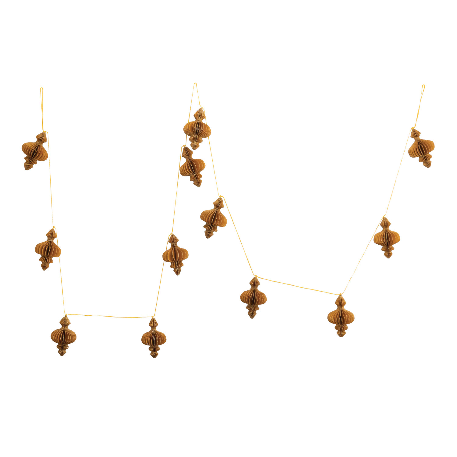 This festive garland features intricately handcrafted recycled paper honeycomb finial shapes finished with gold glitter. Add a touch of festive whimsy to any space with our enchanting collection of garlands, including stunning glass, sleek metal, and delightful mixed-material options, all expertly crafted to create a merry and bright atmosphere.