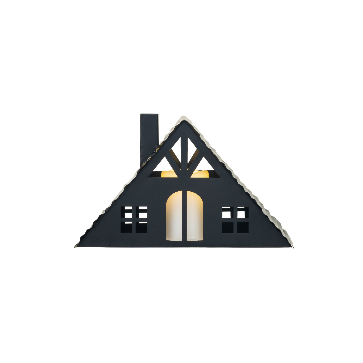 Catalog Name: 9-1/2"L x 4"W x 5-1/2"H Metal House w/ LED Candle, Black (Requires 2-AA Batteries)