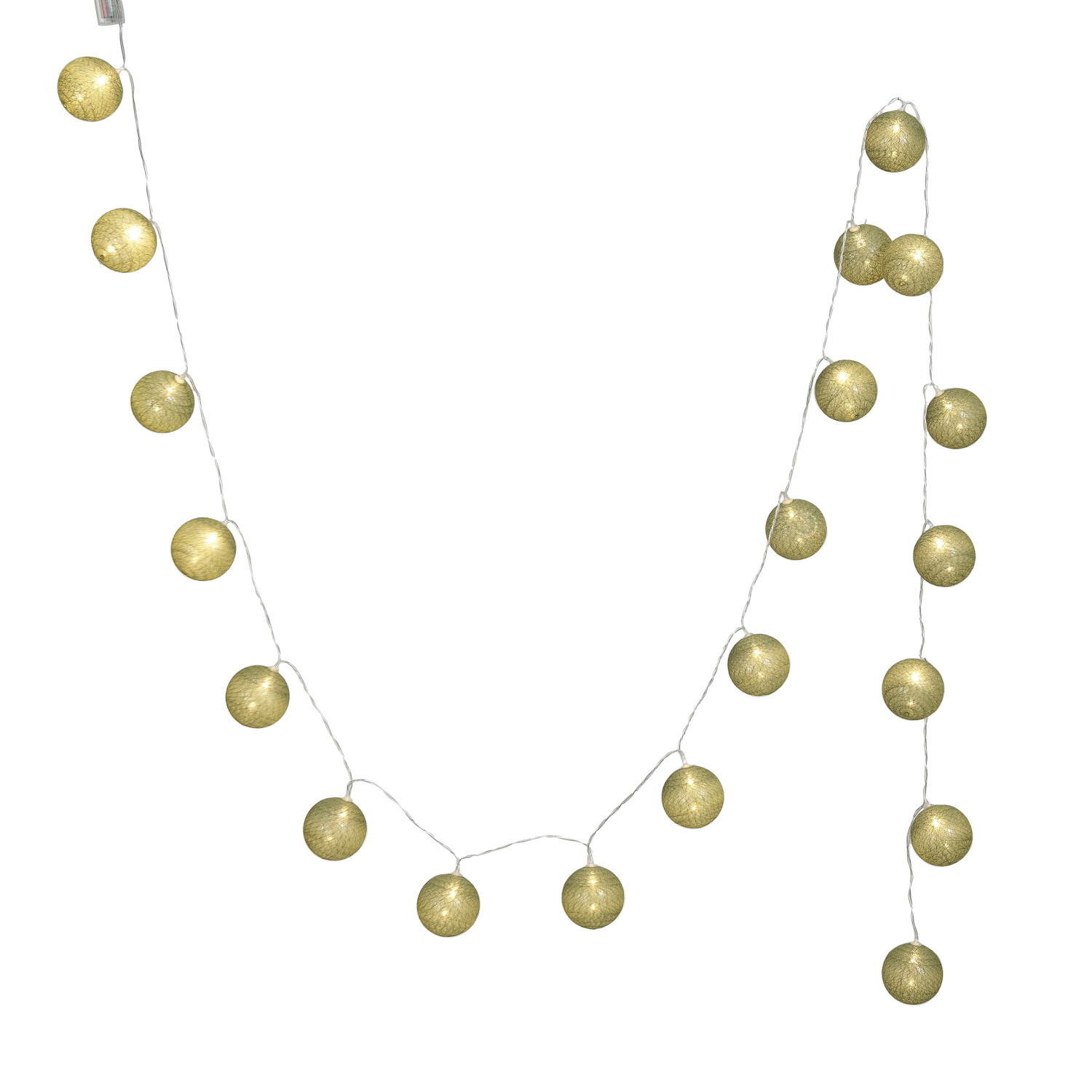 Catalog Name: 118"L x 2-1/4"H Fabric String Ball Lights w/ Plastic Cord & 20 Lights, Green (Requires 2-AA Batteries)