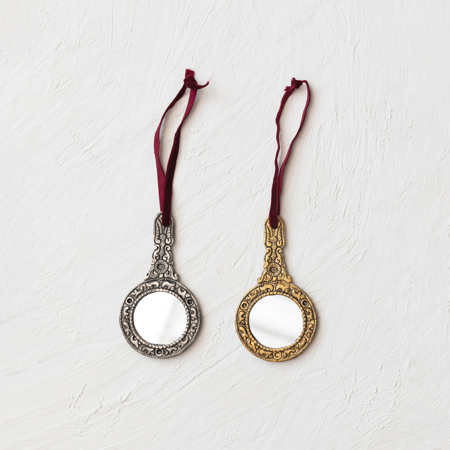 4-3/4"H Embossed Metal & Glass Hand Mirror Ornament, 2 Finishes