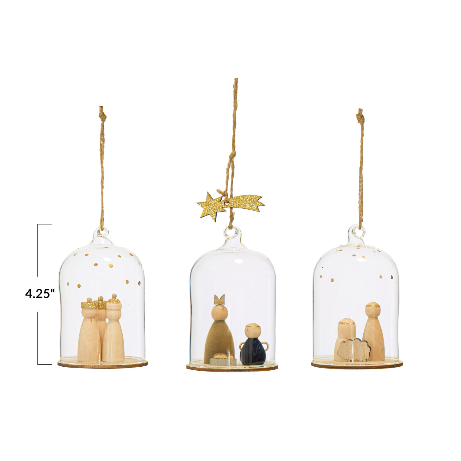 Catalog Name: 4-1/4"H Glass Cloche Ornaments w/ Wood Nativity, Set of 3