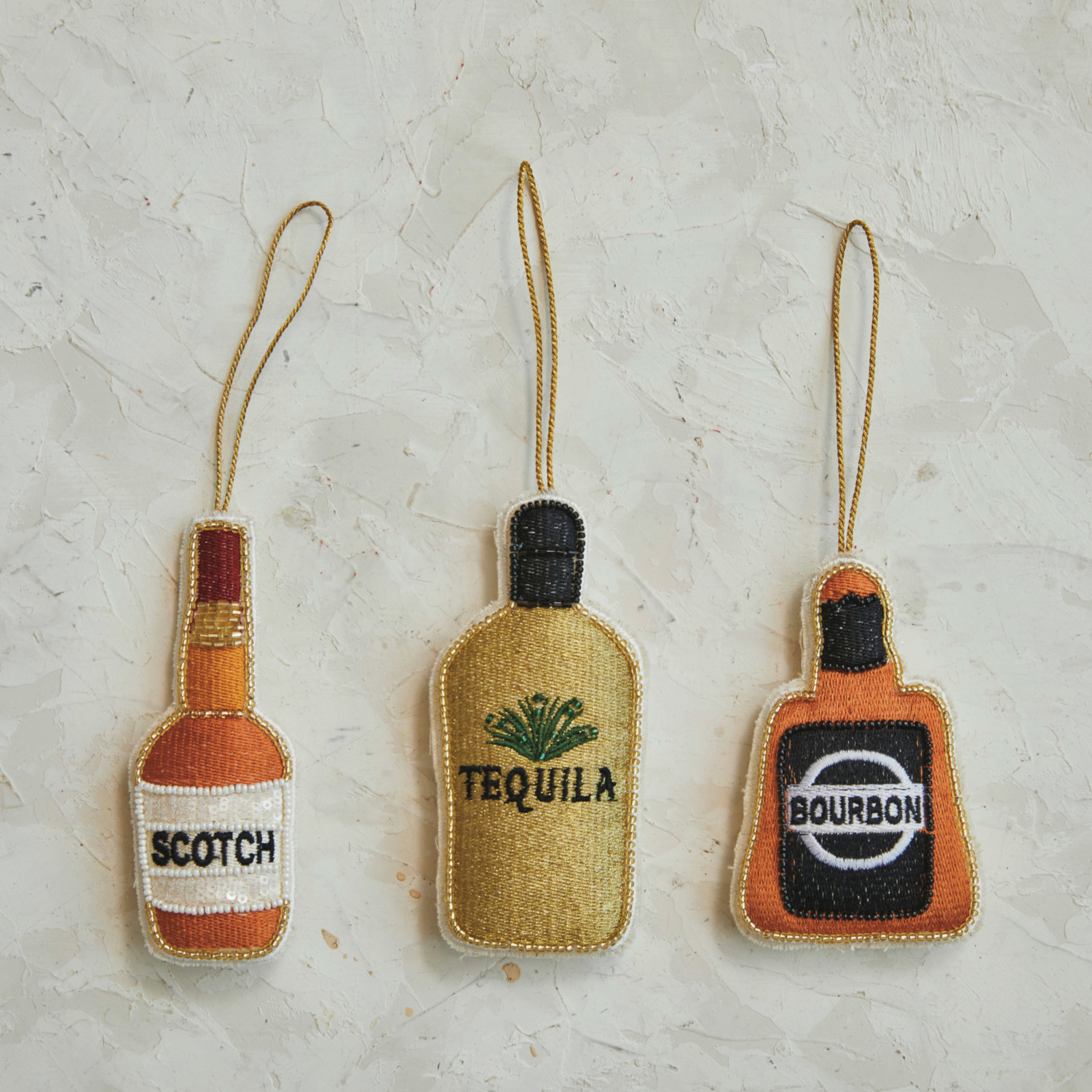 This handcrafted "Bourbon" bottle ornament is a toast to the holidays, with its vibrant glass beadwork and detailed embroidery on a multicolored cotton blend. Measuring 2.75 inches long and 4.0 inches high, it's the perfect size to stand out amidst the greenery of a Christmas tree or to catch the eye on a shelf. Whether it's part of a collection of spirited decorations or a standalone piece, this ornament is sure to add a touch of fun and craftsmanship to holiday gatherings. A festive concoction, this cotton "Bourbon" bottle ornament is bedecked with colorful glass beads and intricate embroidery. An ideal accent for the holiday season, it's perfect for adding a splash of merriment to the festive decor. Ideal for the Christmas tree or as a whimsical addition to a home bar display, this ornament pours out holiday cheer.