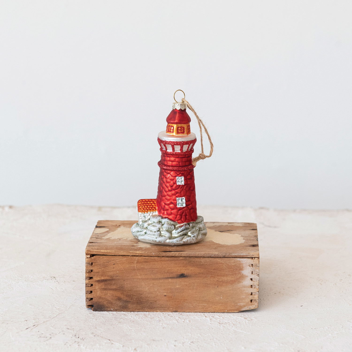 This ornament is a hand-painted glass lighthouse, adorned with a dusting of glitter that catches the light like a true beacon. The multicolored design reflects the diverse hues of the sea, while the glitter evokes the sparkling waves. Standing at 2.75 inches long, 2.0 inches wide, and 5.25 inches high, it's a testament to the lighthouses that have guided seafarers through the ages, now reimagined as a symbol of holiday guidance and warmth. This is a perfect choice for anyone who loves whimsical and adorable holiday decor. A glass lighthouse ornament, sparkling with multicolored glitter, standing as a beacon of festive cheer. An ornament that brings the tranquil charm of a seaside lighthouse to the holiday decor. Perfect for adding a nautical touch to the Christmas tree or as a guiding light in a coastal-themed room.