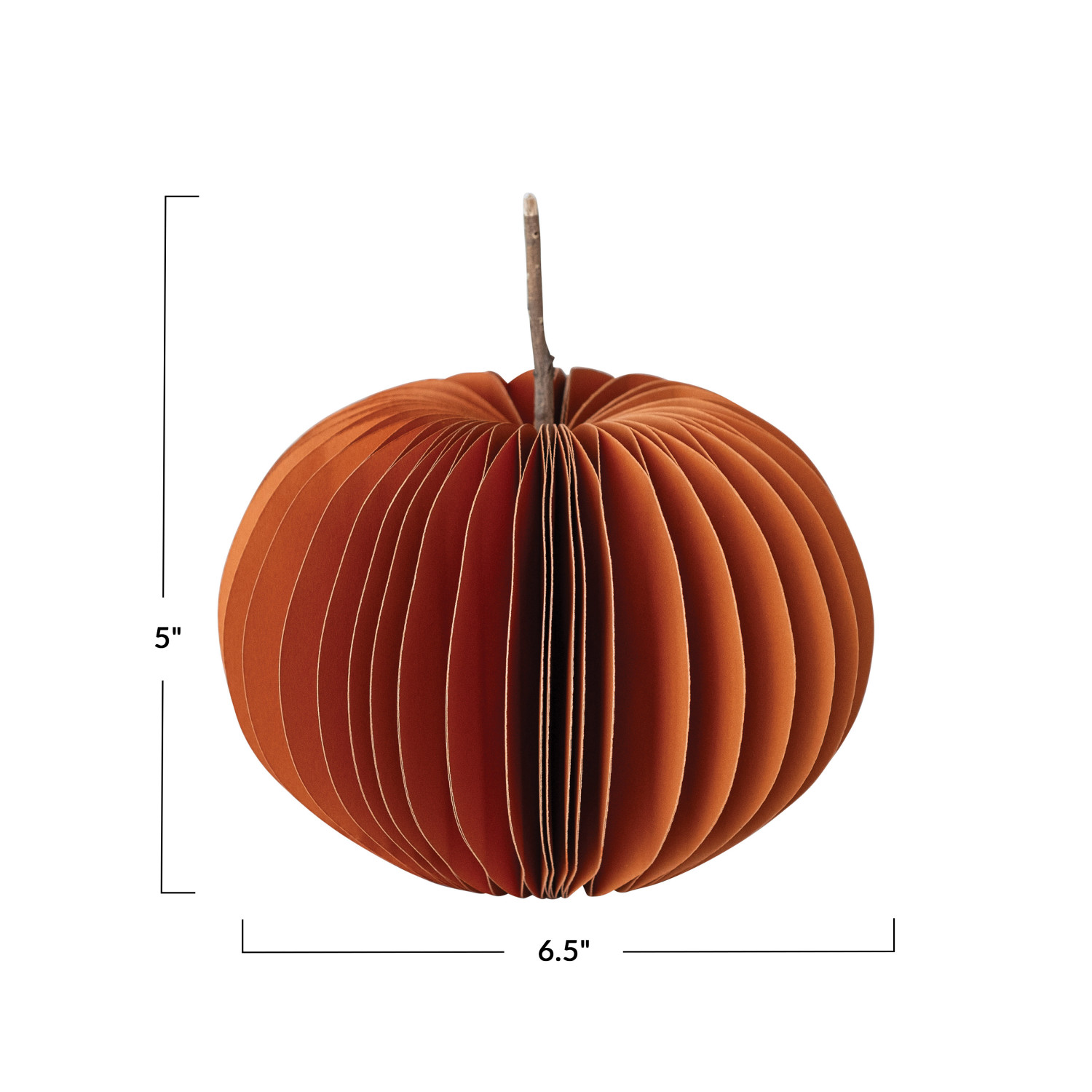Catalog Name: 6-1/2" Round x 5"H Handmade Recycled Paper Folding Honeycomb Pumpkin w/ Dried Natural Twig Stem, Orange Color