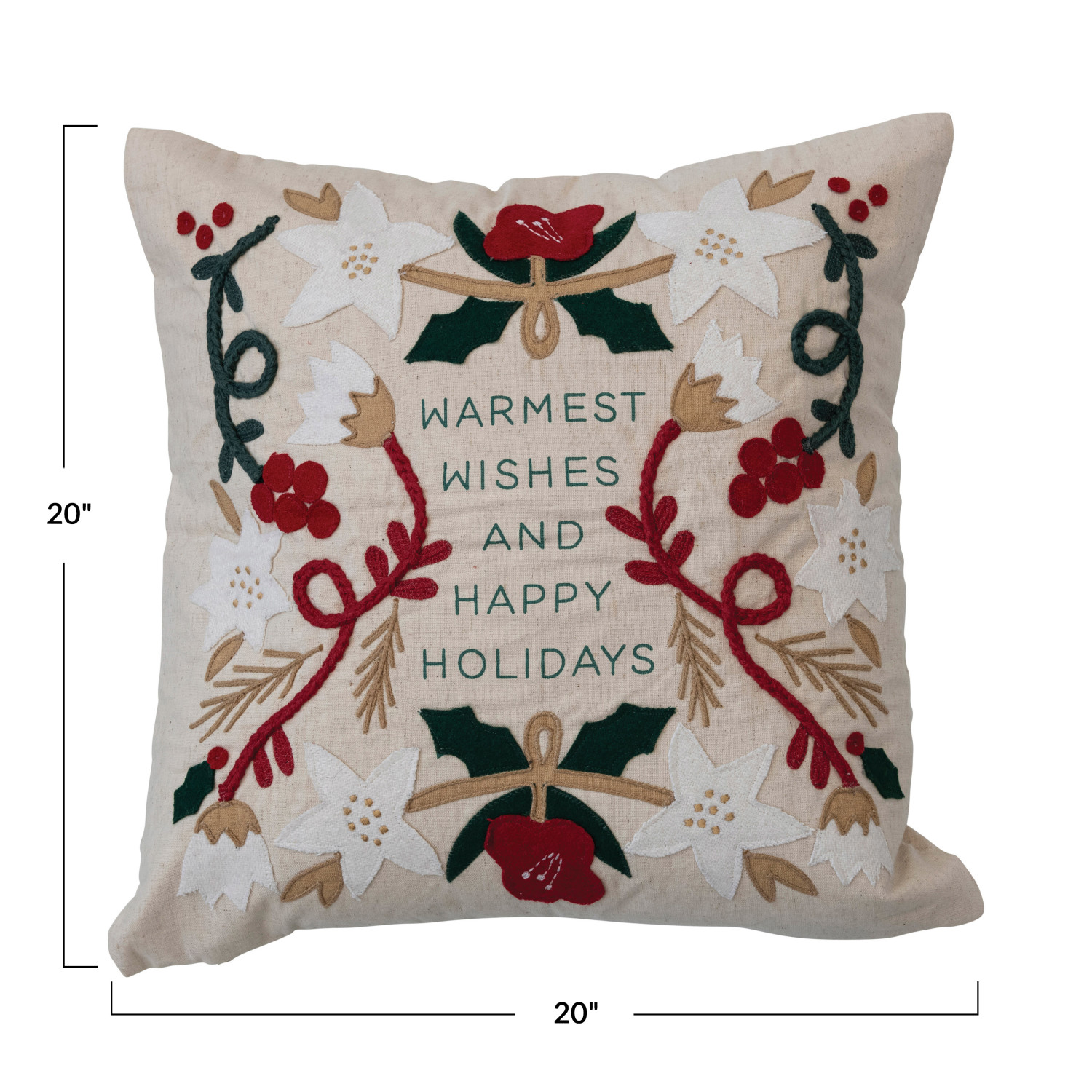Catalog Name: 20" Square Cotton & Linen Pillow w/ Embroidery & Applique "Warmest Wishes.", Multi Color ©