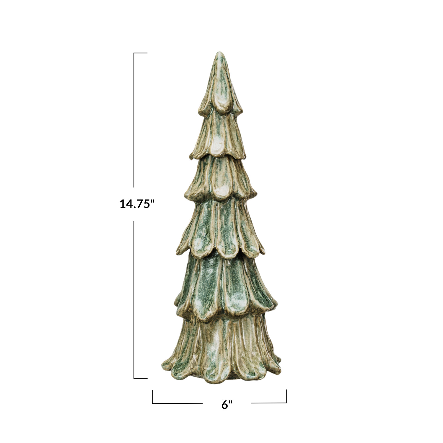 This tall, handmade stoneware tree is a lovely and unique way to decorate for the holidays. It features a handmade stoneware tree that has a reactive glaze and a green color, creating a stunning and eye-catching effect. The tree has a natural and elegant look that can suit any style and theme, from traditional to modern. The tree is ideal for displaying on a table, mantel, shelf, or window sill, where it can add a touch of charm and warmth to the space. The tree can also stand on its own or be paired with other trees or ornaments, making it a versatile and customizable option. The tree is made of stoneware that is durable, smooth, and easy to clean, making it a convenient and reusable option. It measures 6 inches in diameter and 14.75 inches in height, making it a graceful and noticeable centerpiece. Elevate the holiday decor with this eye-catching Christmas tree, adding both style and a touch of whimsy. A tall and unique handmade stoneware tree that has a reactive glaze and a green color. A natural and elegant addition to any holiday decor, this tree brings a touch of sophistication and style to any room. Ideal for displaying on a table, mantel, shelf, or window sill, this tree can stand on its own or be paired with other trees or ornaments.