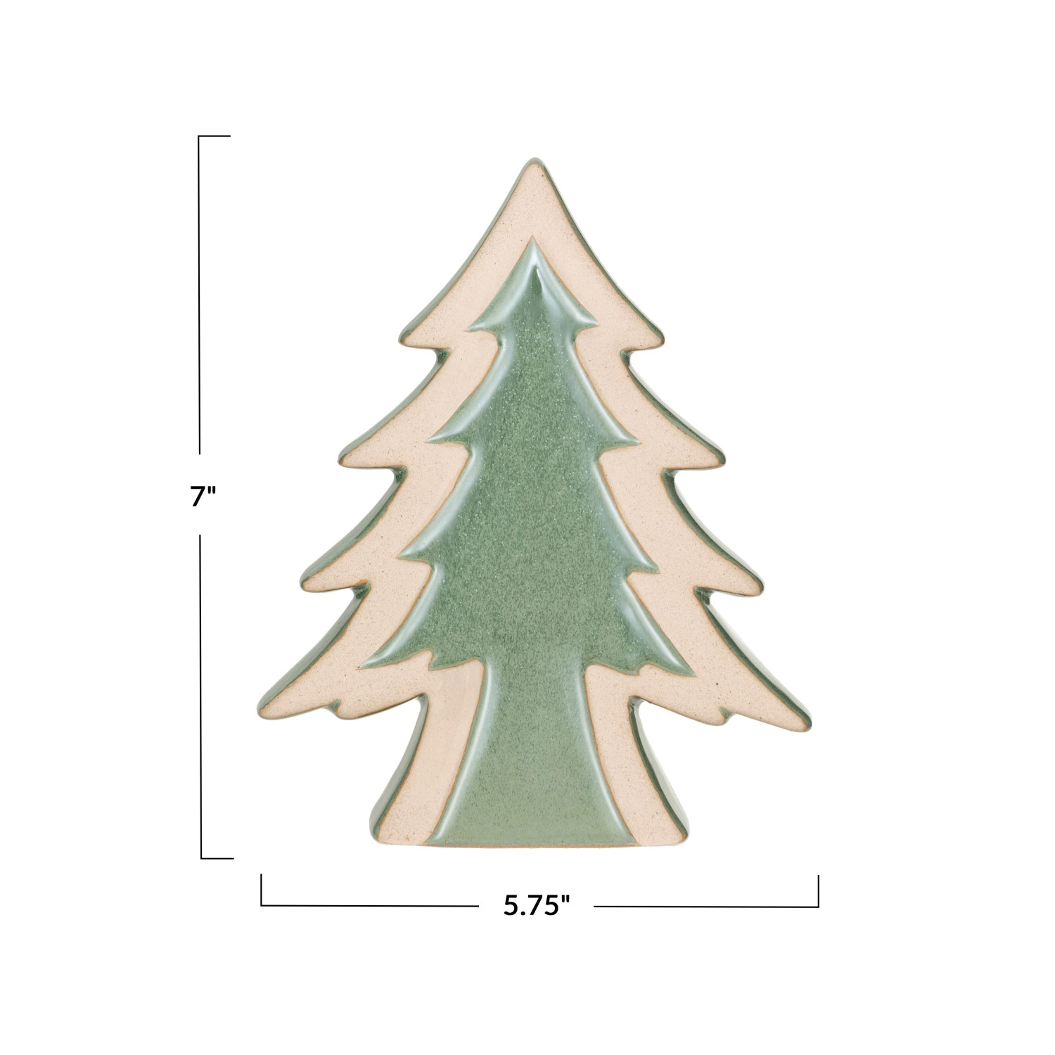 This green unglazed stoneware tree decor with reactive glaze is a beautiful and convenient way to decorate for the holidays. It features a sleek and simple stoneware tree decor with a reactive glaze that creates a unique pattern on each piece, making it a one-of-a-kind item. The tree decor has a green color that blends well with any space and style, adding a touch of sophistication and charm to the decor. The tree decor is ideal for displaying on a table, shelf, or mantel, where it can be used as a standalone piece or paired with other items. The tree decor is made of stoneware that is sturdy, durable, and easy to clean, making it a great choice for holiday decoration. It measures 5.75 inches in width and 7 inches in height, making it a subtle and attractive centerpiece. Elevate the holiday decor with this eye-catching Christmas tree, adding both style and a touch of whimsy. A wide and simple stoneware tree decor with a reactive glaze that creates a unique pattern on each piece. A versatile and elegant addition to the holiday decor, this tree decor suits any space and style. Ideal for displaying on a table, shelf, or mantel, this tree decor can be used as a standalone piece or paired with other items.