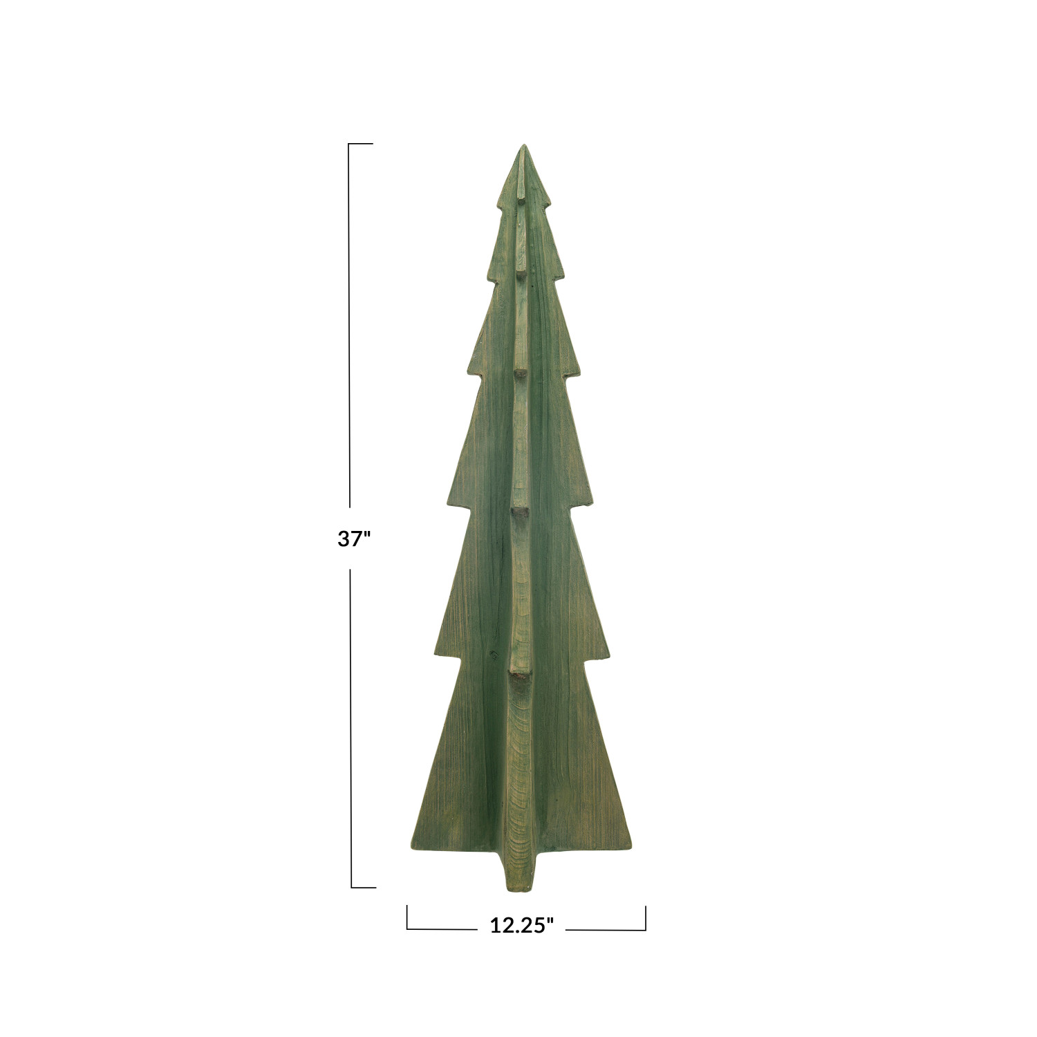 This green magnesia tree with a wood finish is a beautiful and convenient way to decorate for the holidays. It features a magnesia tree with a green color and a wood finish that creates a natural and rustic effect, making it look like a real tree. The tree has a smooth and glossy texture that is pleasant to touch and look at. The tree is ideal for displaying on a floor, where it can add a touch of nature and texture to any space. The tree is made of sturdy and durable magnesia, making it a great choice for holiday decoration. It measures 12.25 inches in diameter and 37 inches in height, making it a noticeable and attractive centerpiece. Elevate the holiday decor with this eye-catching Christmas tree, adding both style and a touch of whimsy. A magnesia tree with a green color and a wood finish that creates a natural and rustic effect. A cozy and charming addition to the holiday decor, this tree adds a touch of nature and texture to any space. Ideal for displaying on a floor, this tree can be used as a standalone piece or paired with other items.