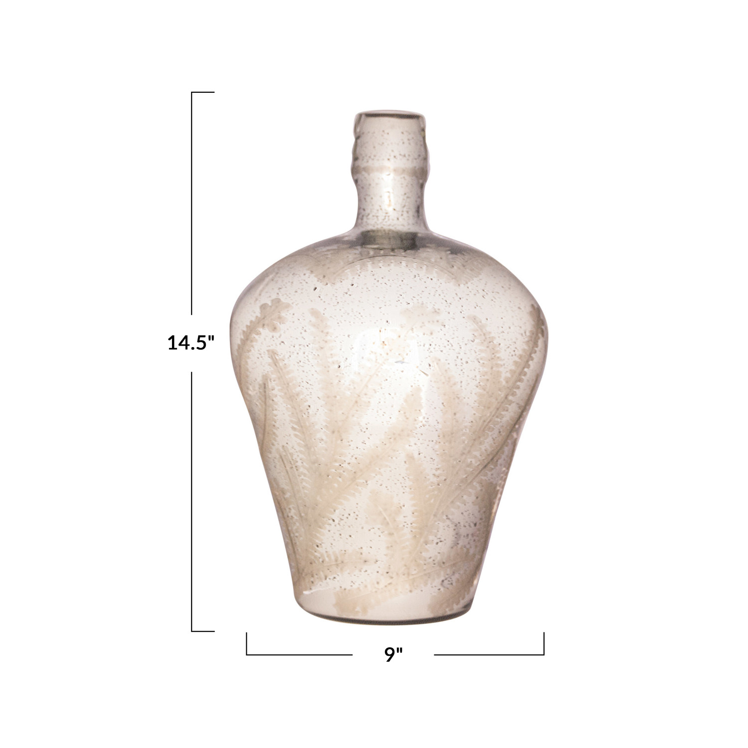 Catalog Name: 9" Round x 14-1/4"H Etched Mercury Glass Vase, Antique Silver Finish