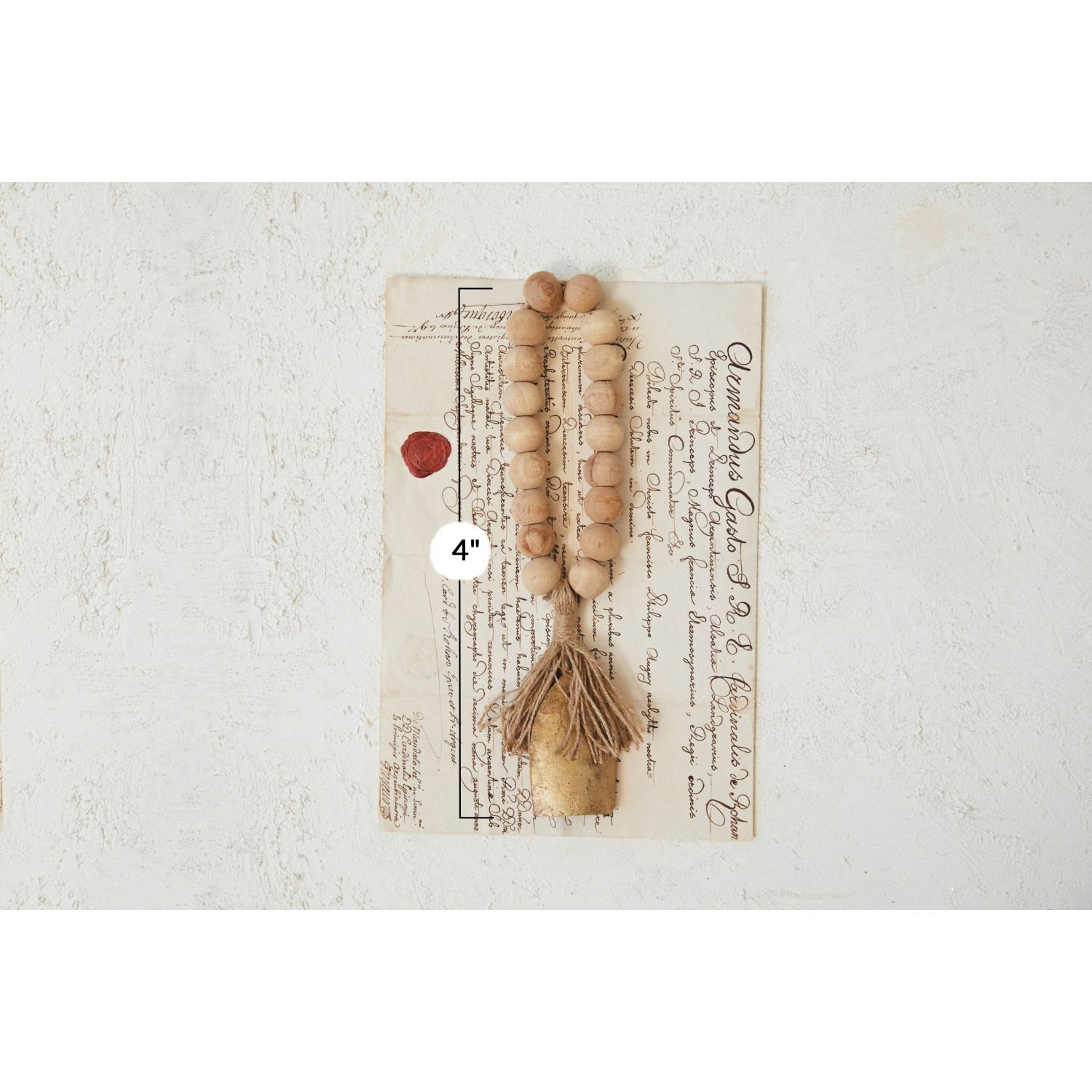 Catalog Name: 13"L Metal Bell & Mango Wood Bead Door Hanger w/ Jute Fringe, Antique Gold Finish, Natural