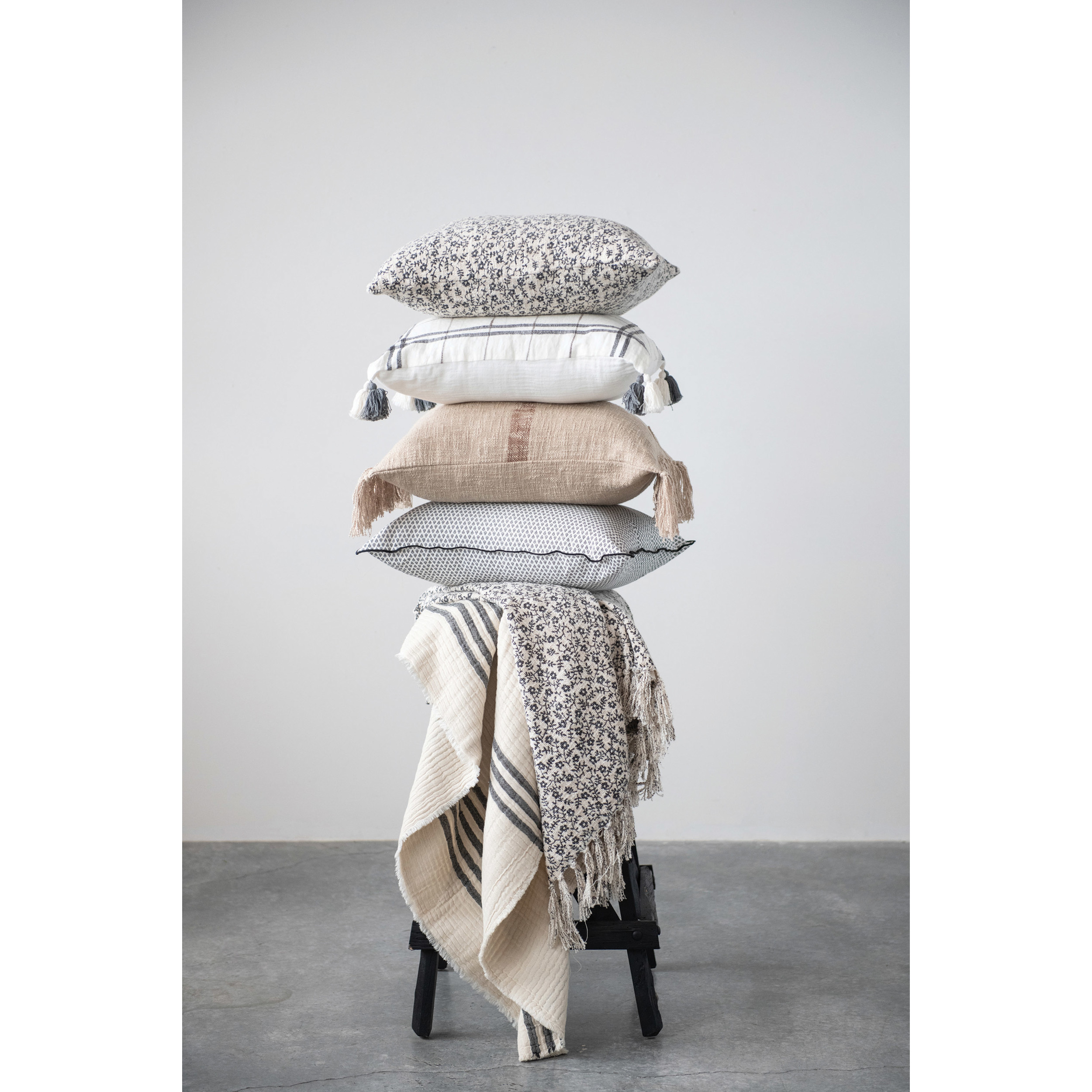 Add warmth and texture to any space with this woven cotton double-cloth stitched throw with a soft and cozy design. This throw is made of pure cotton, a natural and breathable fabric that provides comfort and durability. The throw features a neutral black and cream stripe pattern that adds a touch of elegance and simplicity, while the double cloth stitching adds a touch of charm and personality to the throw. The throw also has a frayed edge detail that adds a touch of rustic and cozy feel to the throw. The throw is suitable for any space needing warmth and texture, such as the living room, bedroom, office, or any other area. It can also be an excellent gift for anyone who loves traditional, coastal, or farmhouse design. This throw measures 60 inches in length and 50 inches in width and is easy to care for. Simply machine wash cold, 30-degree cycle. Do not bleach; tumble dry low. Warm iron if needed. Do not dry clean. Add this woven cotton double cloth stitched throw with stripes and frayed edges to the home and enjoy its beauty and functionality.