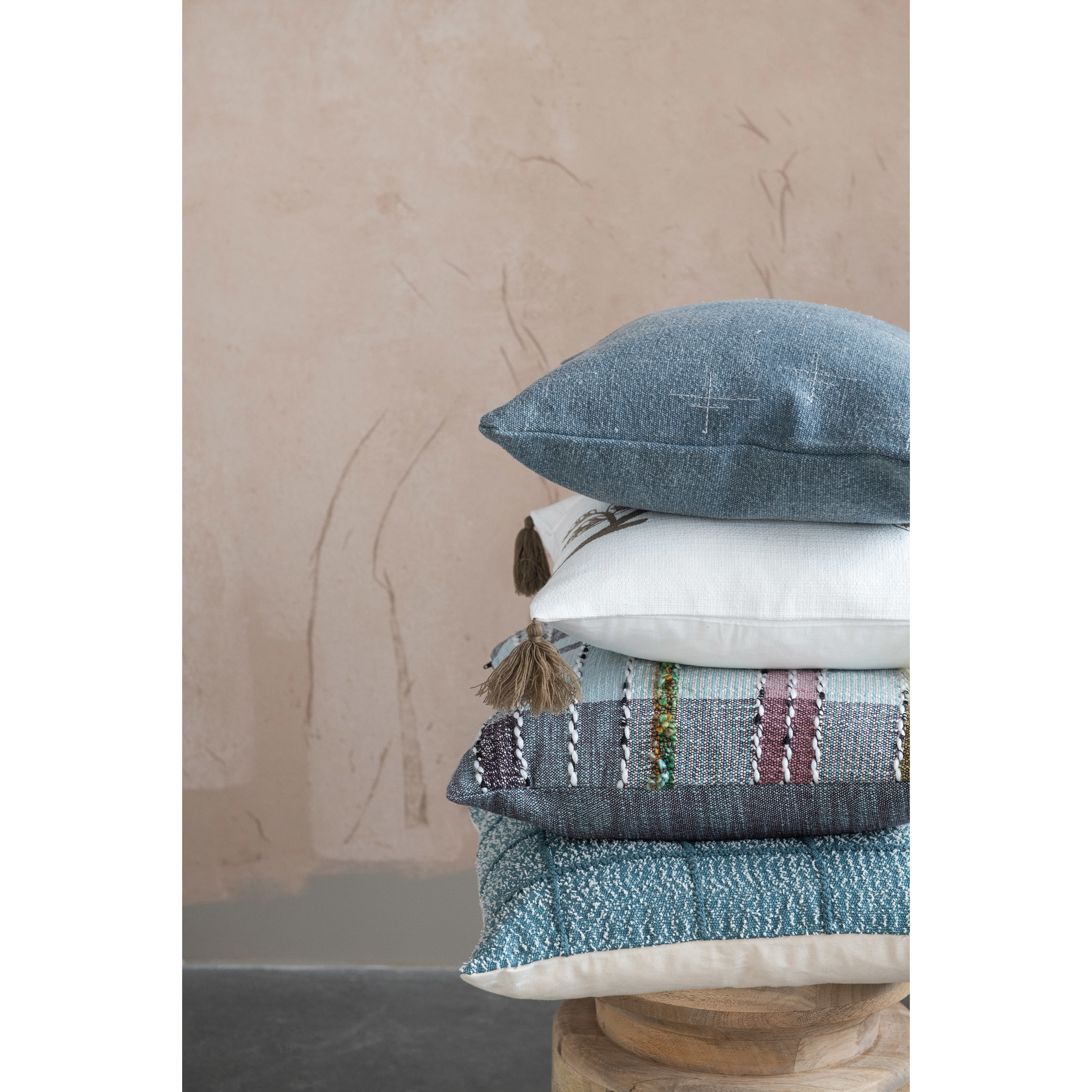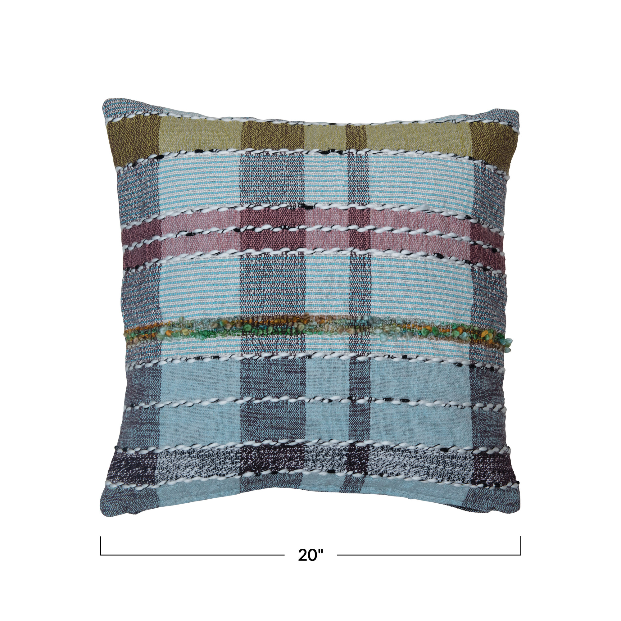 Multicolor woven cotton and wool madras plaid pillow with chambray back; Cover: 55% Cotton, 40% Wool, 5% Other Fiber, Filling: 100% Polyester; 20"L x 20"W x 2"H. Prop 65 Compliant. Dry Clean Only.