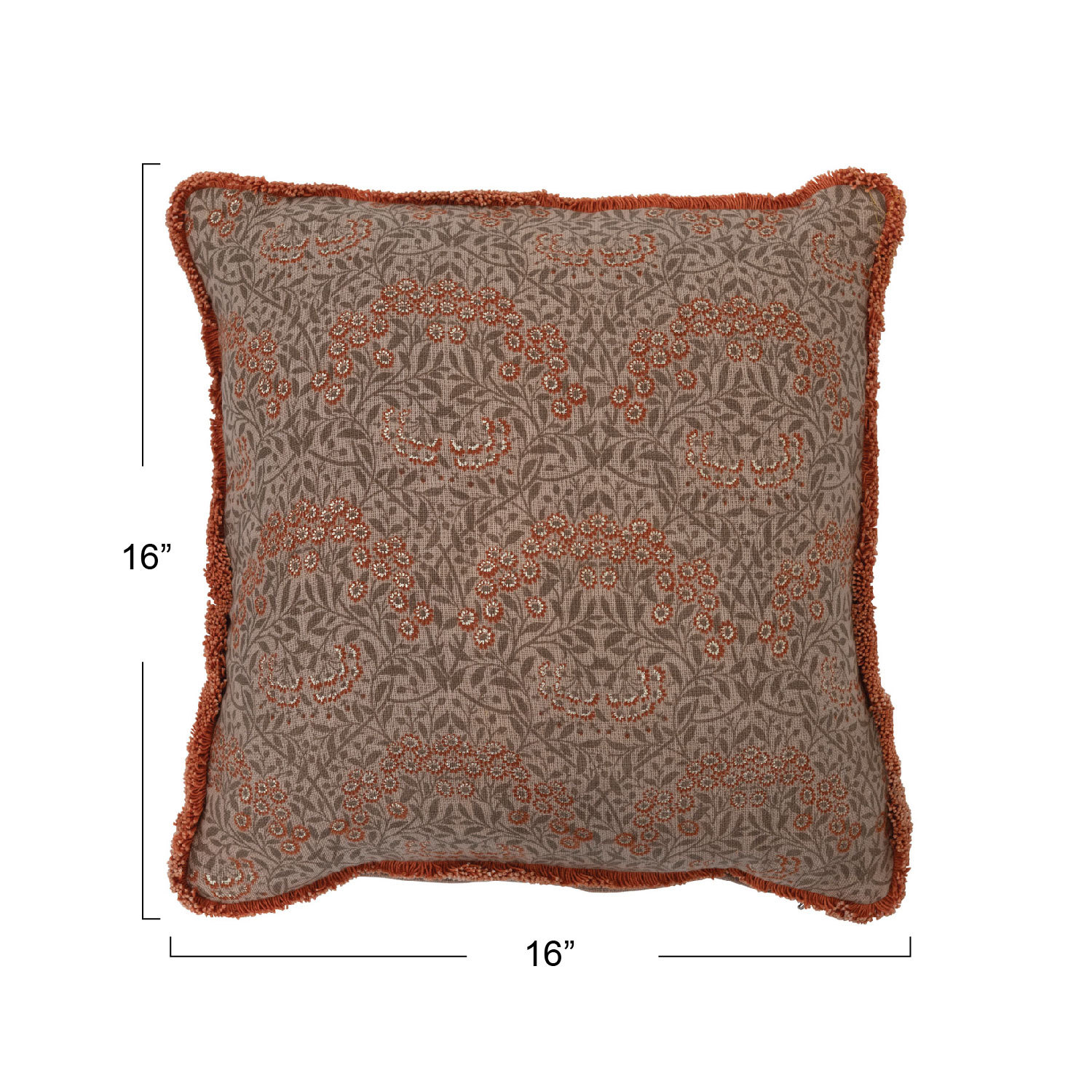 Catalog Name: 16" Square Cotton Pillow w/ Metallic Printed Floral Pattern & Eyelash Fringe, Multi Color