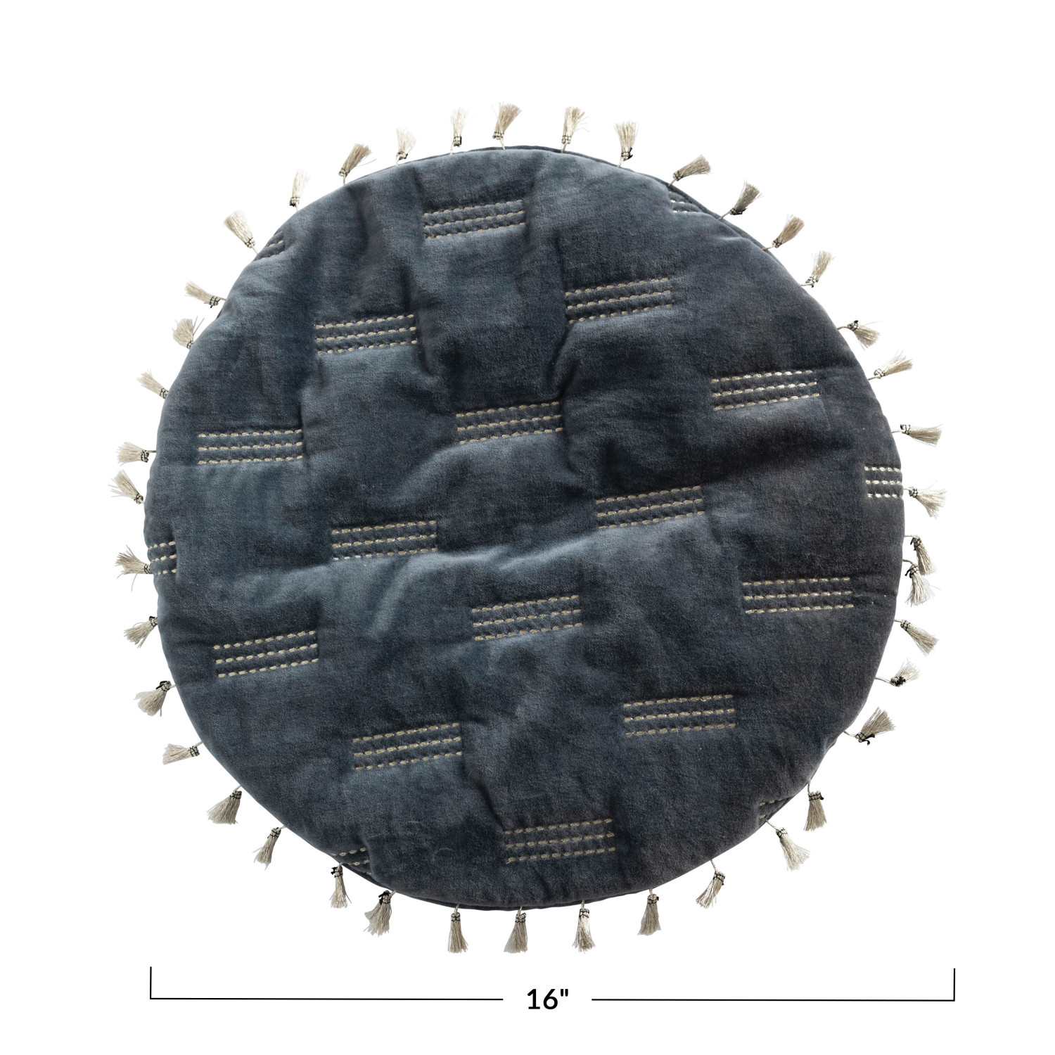 This glamorous throw pillow showcases modern metallic embroidery on luxurious cotton velvet, finished with decorative tassels. Round blue and gold cotton velvet throw pillow with metallic embroidery and tassels; Tonal cotton velvet encasement on back. Express your constantly evolving style with the simple addition of this eye-catching pillow. Removable throw pillow cover and insert; Back zipper with hidden flap; Hand wash cold, do not bleach, warm iron if needed.