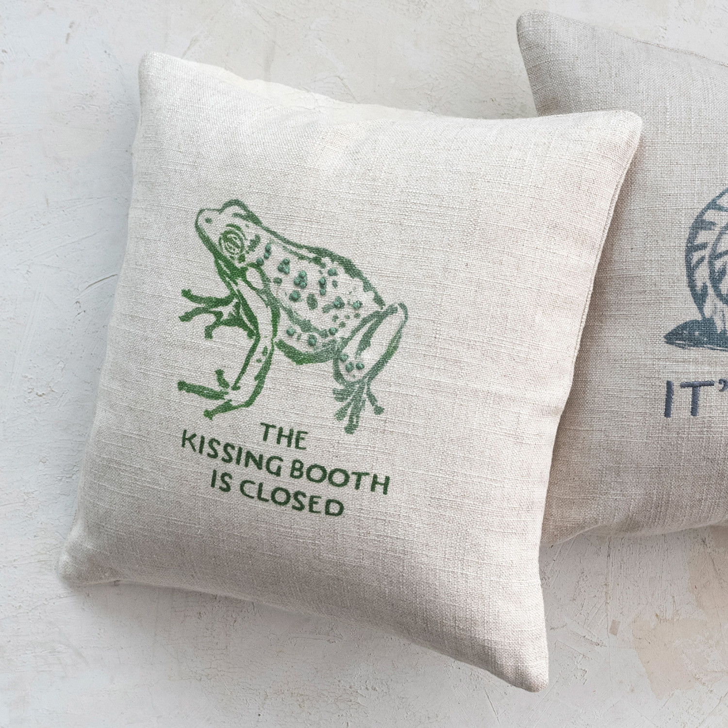 Add a whimsical touch to every home decor with the 16-inch Square Linen Blend Printed Pillow featuring an adorable frog and the playful text "The Kissing Booth is Closed", with Intricate French knots that add dimension and charm to the design. The pillow's linen blend fabric provides a soft and durable texture, while the natural and green color palette complements a variety of interior styles, and can be put on the couch, bed, or favorite chair for a delightful accent. This pillow features a rayon-linen blend cover that is comfortable and durable, and a 16-inch square shape that is versatile. This product is made of rayon and linen blend. This pillow measures 16 inches in length and 16 inches in width. Add a whimsical touch to every home decor with the 16-inch Square Linen Blend Printed Pillow featuring an adorable frog and the playful text "The Kissing Booth is Closed", with Intricate French knots that add dimension and charm to the design. The pillow's linen blend fabric provides a soft and durable texture, while the natural and green color palette complements a variety of interior styles, and can be put on the couch, bed, or favorite chair for a delightful accent. This pillow features a rayon-linen blend cover that is comfortable and durable, and a 16-inch square shape that is versatile. This product is made of rayon and linen blend.