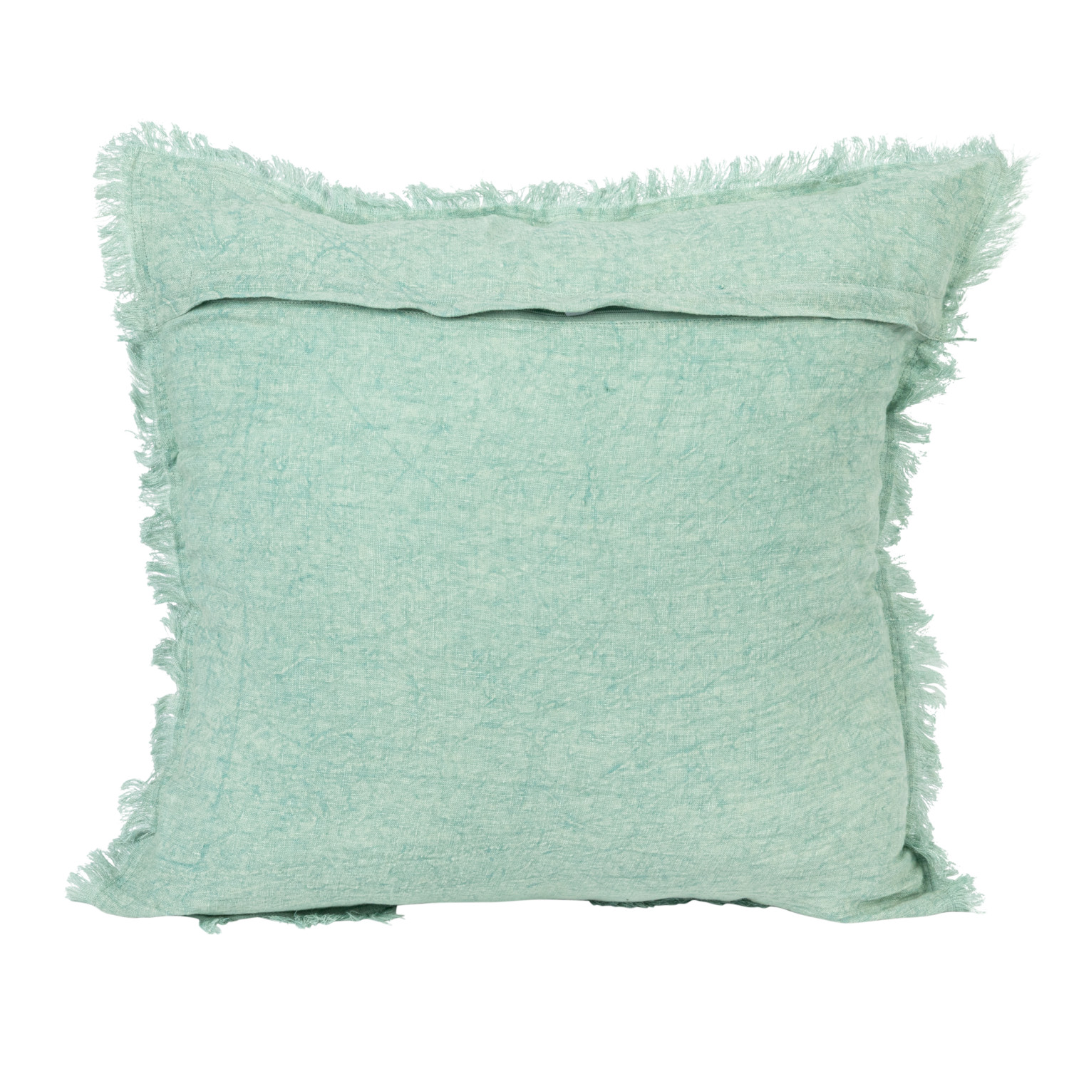 This stonewashed linen pillow with fringe in mint green is the perfect way to add a touch of natural style and texture to the home. The soft yet durable linen fabric and playful fringe make it a statement piece in any room, while the polyester fill provides comfort and support. The pillow features a back opening for easy insert removal and is machine-washable for easy care. It is also perfect for any room in the home, from the living room to the bedroom. Use it as a throw pillow on the couch or bed or as a floor pillow to create a cozy seating area. It is also an excellent gift for any occasion. The cushion measures 20 inches long and 20 inches high. Whether used as a lumbar support on the couch or as a decorative accent on the bed, this quality pillow will make the home more beautiful and cozy. A soft and cozy square pillow with a stonewashed linen cover, featuring a mint color and fringe on the edges. With back opening; add some natural style to a neutral-colored room. Polyester fill insert included. The pillow cover is made from linen; the insert is made from polyester.